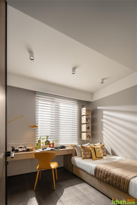 男孩房設(shè)計以黃色作為主色調(diào),充滿了活力和歡快。墻面上裝飾魔方儲物空間,為房間增添了趣味和創(chuàng)意。空間布局簡潔明快,以實用為主導(dǎo)。床鋪、書桌和衣柜等家具均采用簡約的線條設(shè)計,符合現(xiàn)代審美表達(dá)。