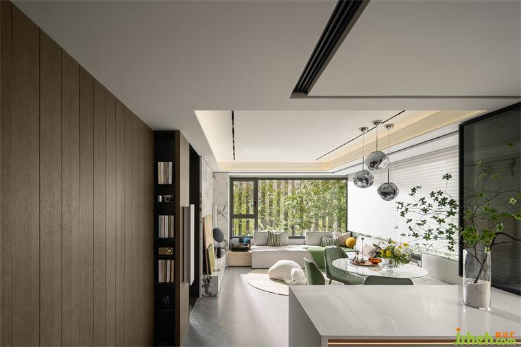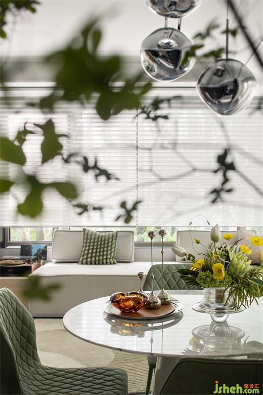 L型沙發(fā)設(shè)計(jì)最大化地利用了采光,提供了大面積的社交娛樂空間。MINI吧臺結(jié)合客餐廳一體的設(shè)計(jì),有效拓展了公共區(qū)域的活動范圍與分區(qū)層次,最大化挖掘相鄰場域的互動。