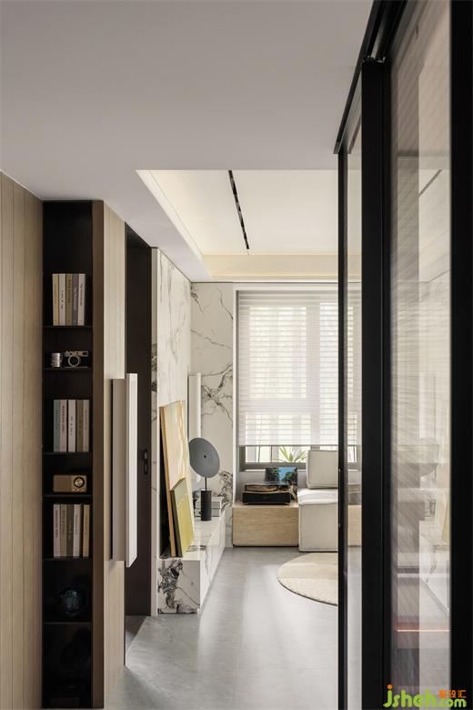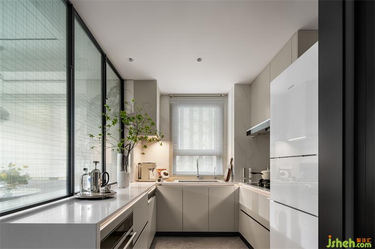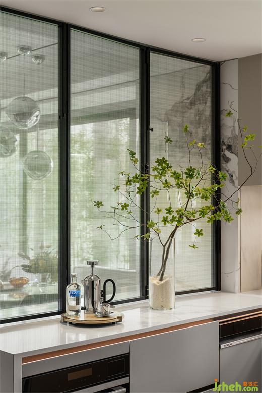 空間的尺度遵循完美的設(shè)計(jì)比例,推拉式的窗戶設(shè)計(jì)延伸了空間功能,完全打開之后形成交互式的廚房設(shè)計(jì),和諧且美觀,樣板間設(shè)計(jì)于細(xì)節(jié)處彰顯設(shè)計(jì)師對功能梳理的匠心思考。