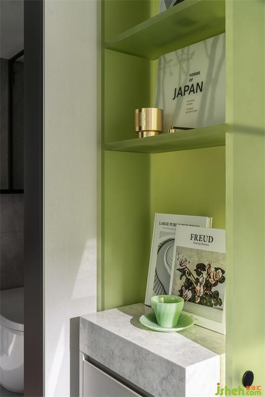 綠色亞克力衣柜色調(diào)清新自然,與主臥的年輕氛圍完美融合,為主臥設(shè)計(jì)注入時(shí)尚氣息。空間橙色跳色恰到好處,為空間增添了一抹活力與靈動,藝術(shù)掛畫呈現(xiàn)出年輕人的生活態(tài)度與個(gè)性張揚(yáng)。