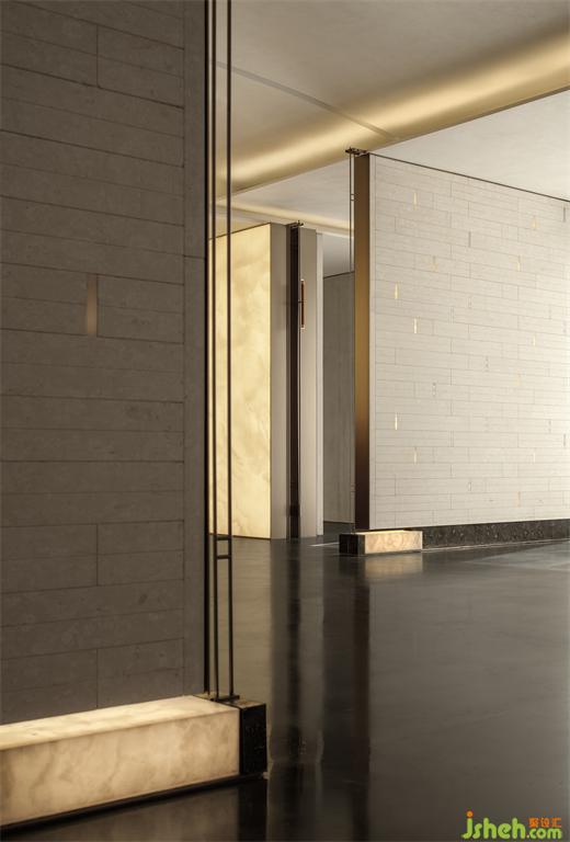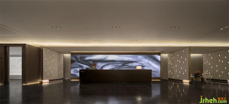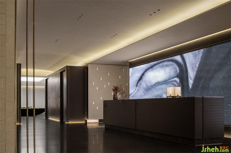 步入接待大廳,設(shè)計采用大量簡潔、硬朗的線條勾勒空間,沒有雕花或鑲嵌的華麗,反而展現(xiàn)出流暢和開放的氛圍。一抹東方墨色鋪就空間底色,前臺如同一方墨條橫置于界面中央,以現(xiàn)代設(shè)計的手法展現(xiàn)了富有東方色彩的雅致與韻味。