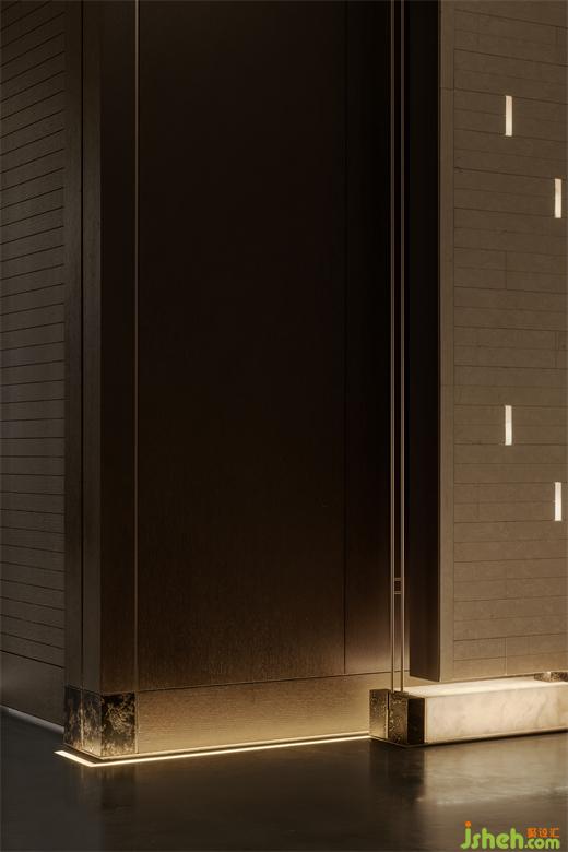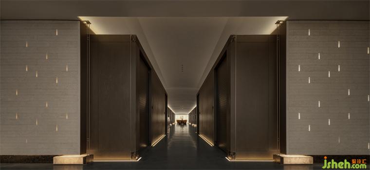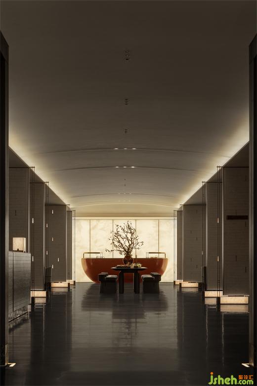 目光所及最東處,整個洽談和水吧區(qū)的室內(nèi)造型,以經(jīng)典中式空間排布形式“中軸對稱”為骨,層層遞進,組成規(guī)整且具有縱深感的空間,一步一進,在平衡中給來訪者營造雅致奢華的儀式感,塑造威儀的同時又極具人文關(guān)懷??臻g軟裝陳設(shè)也延續(xù)對稱手法,左右互為鏡像,秩序井然、擺放有序,折射傳統(tǒng)文化底蘊。