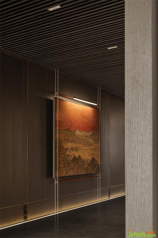 映入眼簾的山水意境畫,在整體光線偏暗的環(huán)境下,剛好透著一絲微弱的暖光,營銷中心設(shè)計為沉靜厚重的中式氛圍增添一抹亮色。
