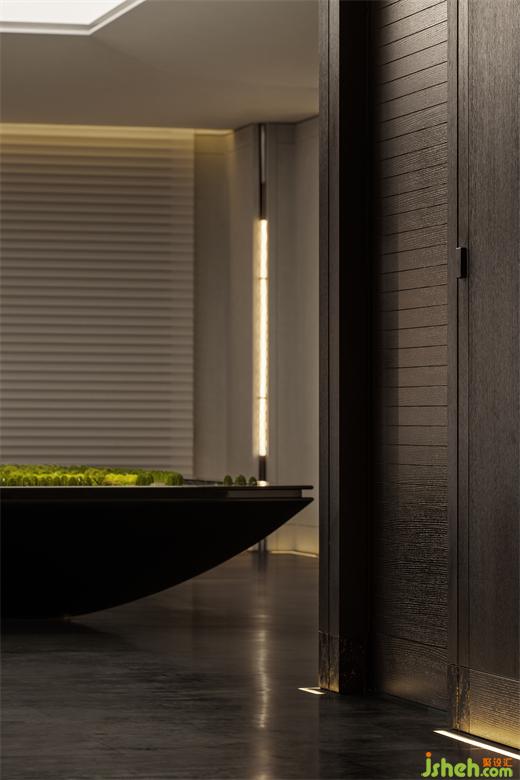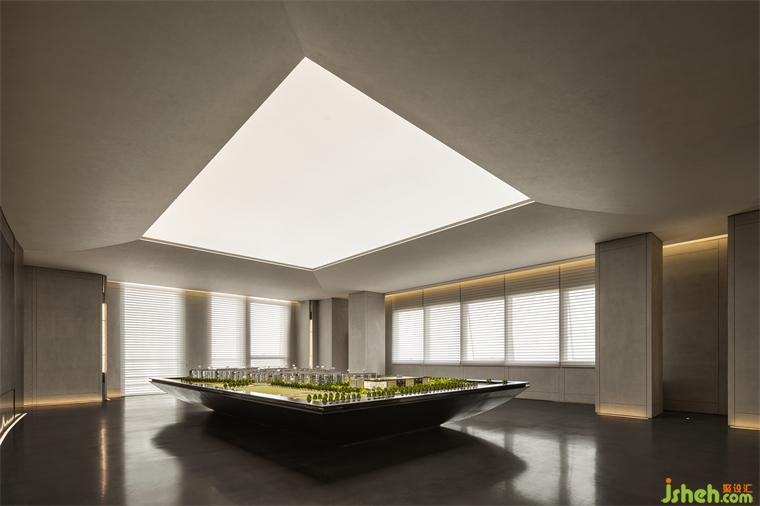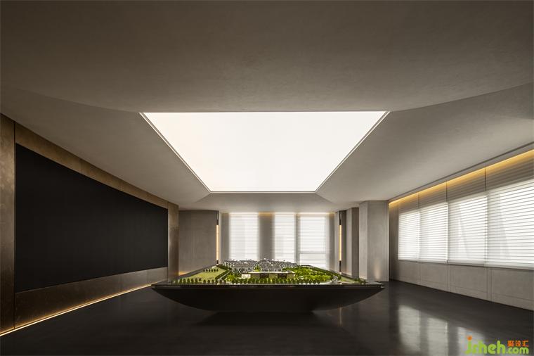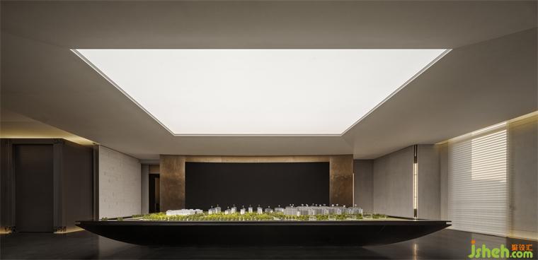 迎賓處望西,行至展廳。營銷中心設(shè)計采用黑色烤漆的材質(zhì)做底的樓宇沙盤,似乎嵌于巨大“硯臺”之上,別具一格。在天頂泛光的照耀下,沙盤如同聚寶盆般,吸納天地間萬物之氣,融匯成獨特的氛圍,更添空間的文化韻味,展現(xiàn)了歷史與現(xiàn)代的交融。
