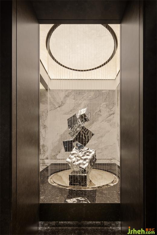 天人合一,細水長流。室內(nèi)藝術裝置采用藻井的設計,四邊呈方形,中間呈圓形,取“天圓地方”之意,地臺為天花的鏡像,水簾仿佛連接天地之間的通道,水自天地內(nèi)傾瀉而下。錯落有致的金屬雕塑,為空間加注靈氣。