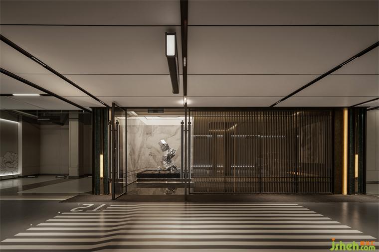 在中式文化中,天地萬物都有其特定的位置和順序,這是自然規(guī)律和社會秩序的基礎??蛷d四方具玉石燈的墻面造型,體現(xiàn)了序列感的文化基因。