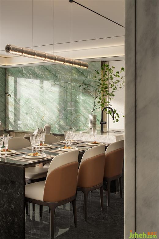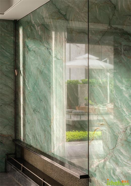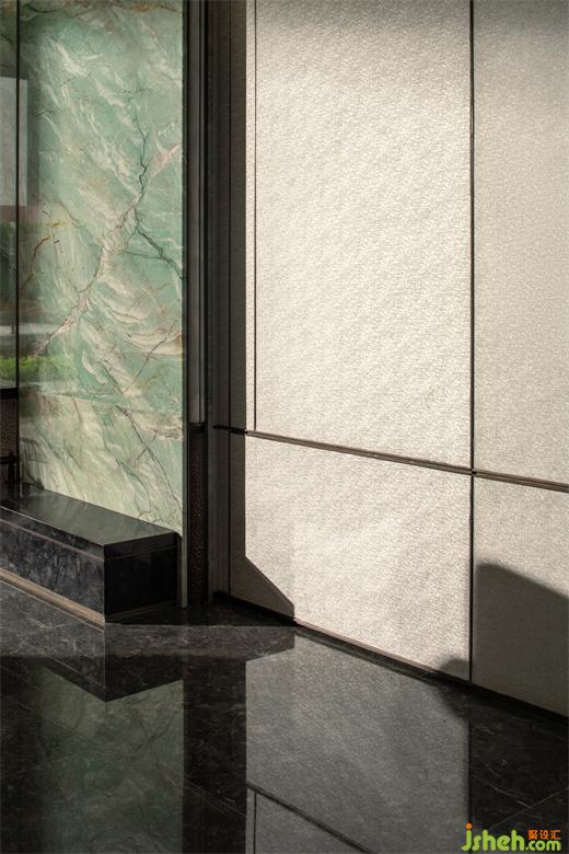 奢華并不是一種張揚,而是一種內(nèi)斂??蛷d主背景采用大面積加雅綠大理石,再現(xiàn)山川湖泊之意,暗示中式山水文化中人與自然和諧共生的關系。