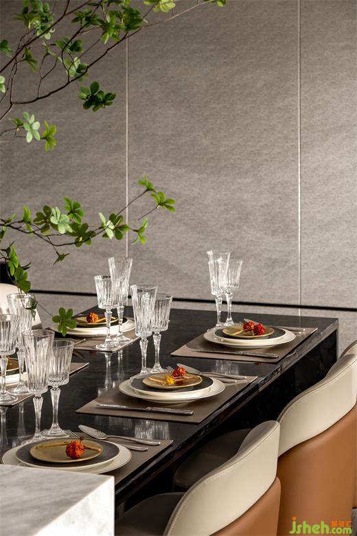 從玄關進入,首先映入眼簾的是開放式布局的客餐廳,大尺度的空間為家庭提供充足的互動交流空間,雅奢共萃的設計構(gòu)成一種自然與人文融合的空間場域。