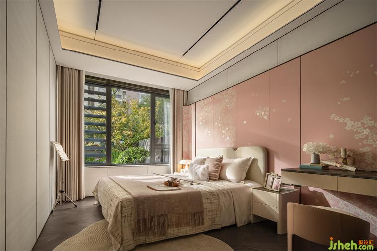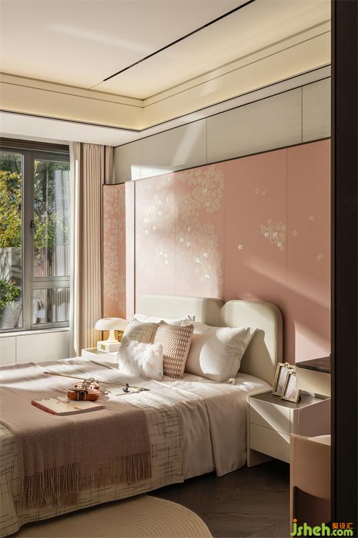 進(jìn)入女孩房,立馬被一種溫柔、浪漫的氛圍所包圍,室內(nèi)色調(diào)以米白和粉色為主,背景墻設(shè)計(jì)手法一以貫之,空間氛圍溫馨自然。