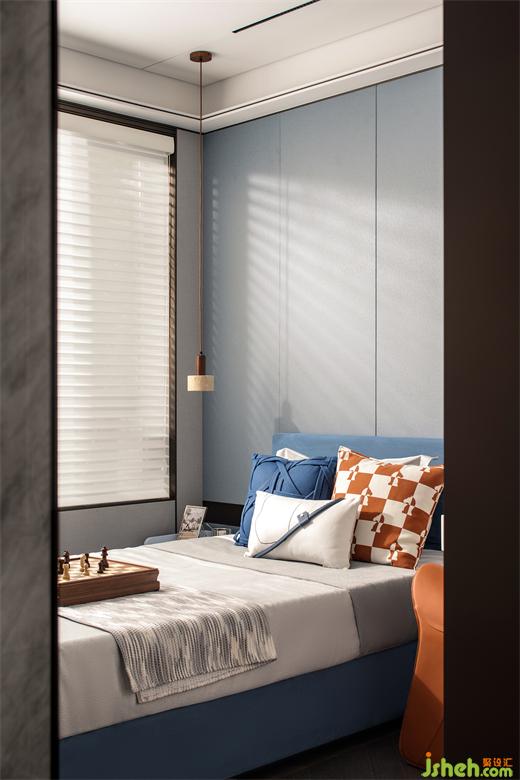 男孩房以藍(lán)色為主色調(diào),國際象棋展示男孩的個(gè)性和興趣,個(gè)性化的家居元素增強(qiáng)其對房間的歸屬感和滿足感。