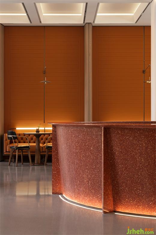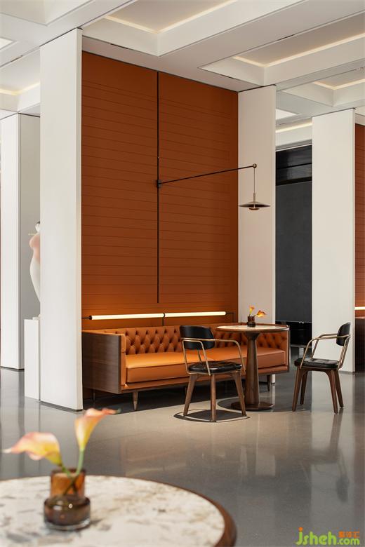 售樓處設(shè)計(jì)契合品牌的橘調(diào)墻板,融合柔調(diào)的線性墻飾和充沛的自然光線,將層層暖意滲透進(jìn)空間內(nèi)里,與家具陳設(shè)形成對(duì)話,賦予舒緩而溫暖、靜謐而安逸的洽談意境。