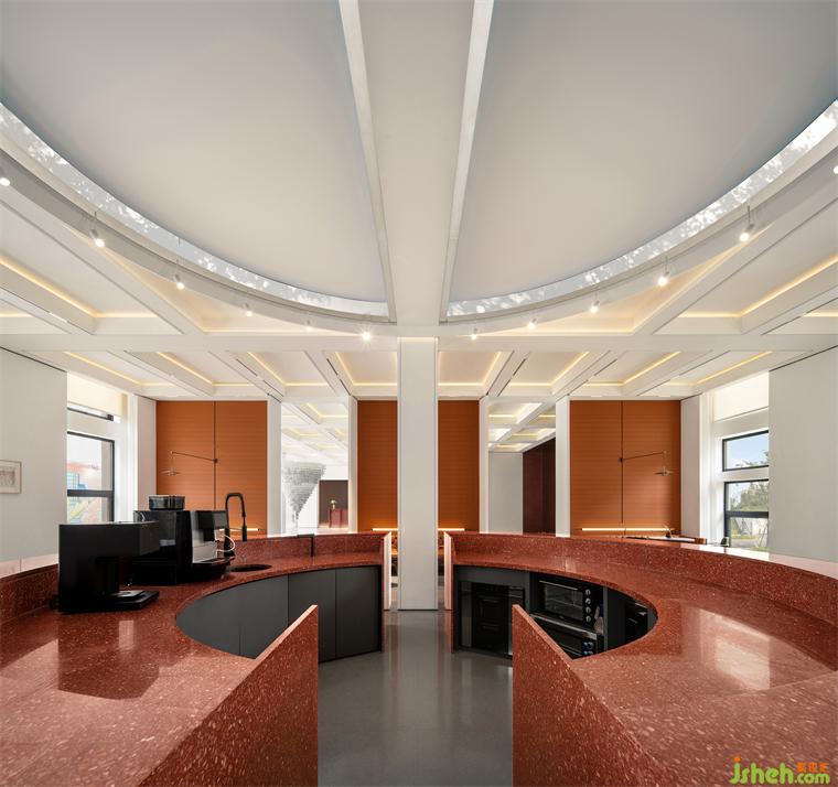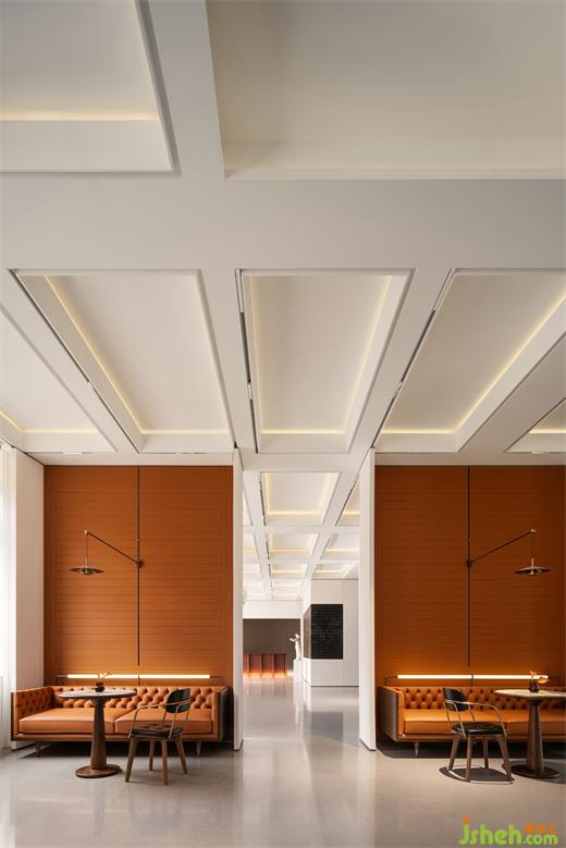 格式天花之下,是圓與方、光與影的自然融合。嵌入式燈帶跟隨日夜與四季的流動(dòng),不時(shí)地散發(fā)出白日光、暗夜色的光暈,為原本陣列式的空間帶入了輕盈的靈動(dòng)感。白天可以享受午后的陽光與樹影婆娑,也可以尋求傍晚抵臨夜間那一片刻的放松。