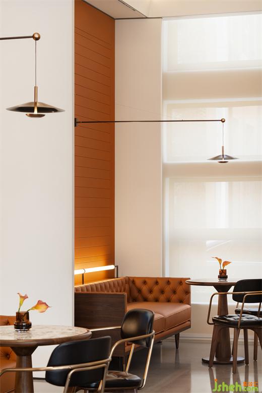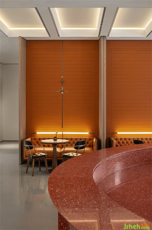 色彩和肌理的映襯,是傳遞空間微妙情緒的語匯。卡座區(qū)、VIP室則以咖啡吧臺(tái)進(jìn)行整齊的排布與圍合,被置于空間的四周。
