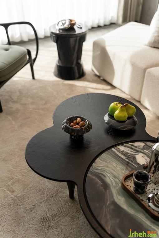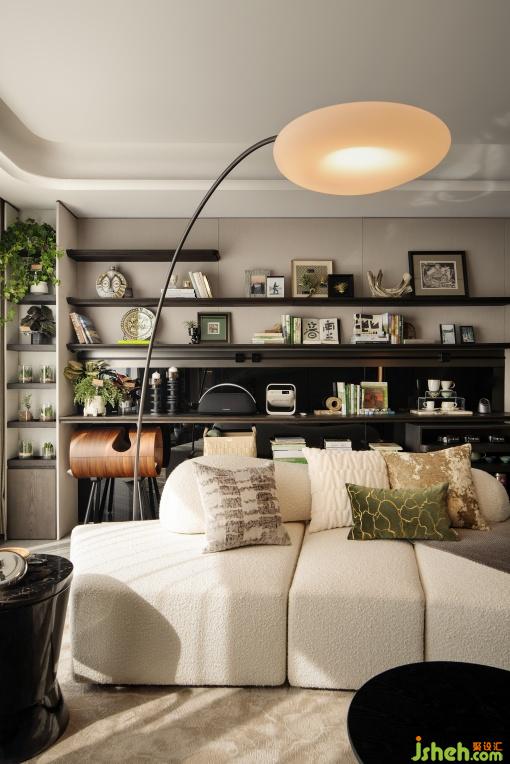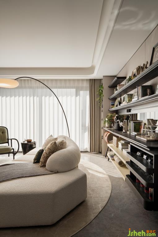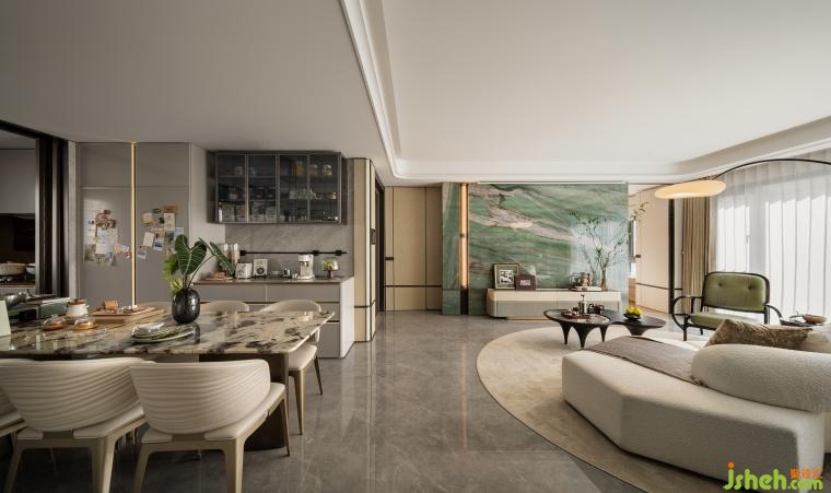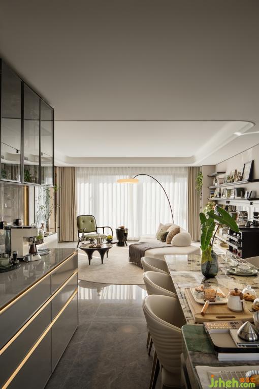 這是設(shè)計師為活力家庭量身定制的“生活劇場”。LDK一體化空間通過幾何形沙發(fā)與靈活桌椅布置構(gòu)建圍合式交流場景,可自由組合為咖啡研磨角、觀影空間或親子游戲場。6米通廳打破傳統(tǒng)邊界,背景墻以玉石般的光澤和紋路折射出自然意趣,懸浮書架層展示收藏的杯碟、書籍與音響,功能與展示的邊界在此消融。