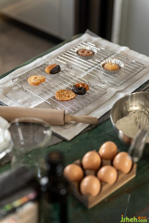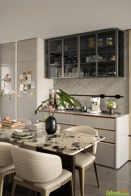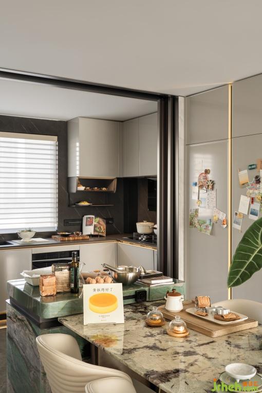 中央島聯(lián)動餐桌與西廚,將用餐儀式感與生活煙火氣完美融合。大理石餐桌嵌套綠色島臺,咖啡機的香氣與玻璃器皿的質(zhì)感交織。餐桌在早餐吧、臨時辦公桌、親子烘焙臺之間無縫切換,空間成為一場持續(xù)進行的感官實驗。