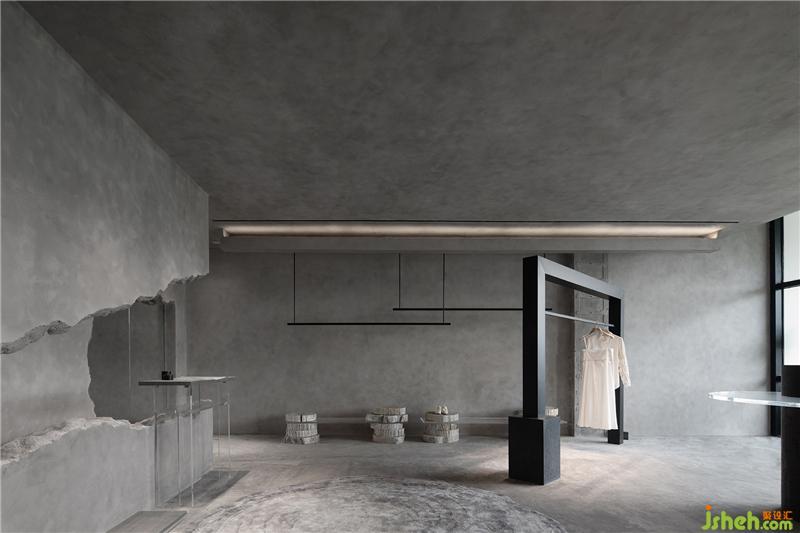 店鋪裝修設(shè)計設(shè)計師對空間的靈感來源是受到美國當代藝術(shù)家Daniel Arsham的未來考古風(fēng)影響,在設(shè)計上保留原建筑效果,打造出開裂的墻壁,它在空間中表達出考古空間的同時,將一道道墻壁視作為阻擋,斑駁的墻體被一種牽引力肆意地撕扯,當連接著天花板和地板之間的墻壁裂開,泥石崩塌,另一個不同世界將慢慢呈現(xiàn)出來,仿佛這是一個開裂的廢墟世界,也是空間與空間之間的交接間點。