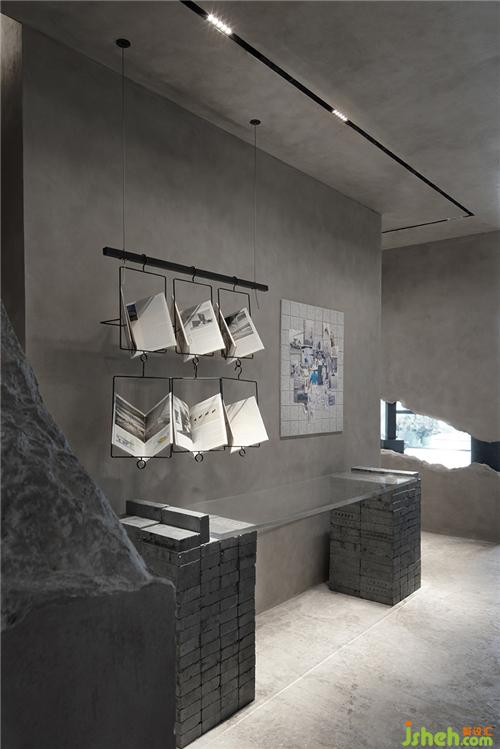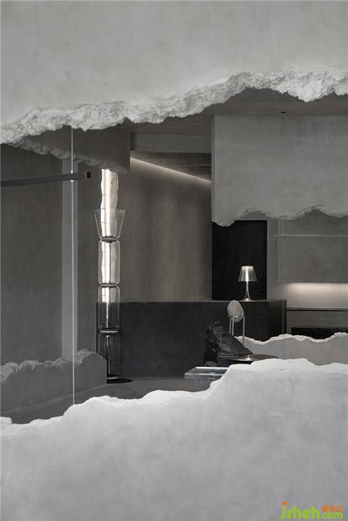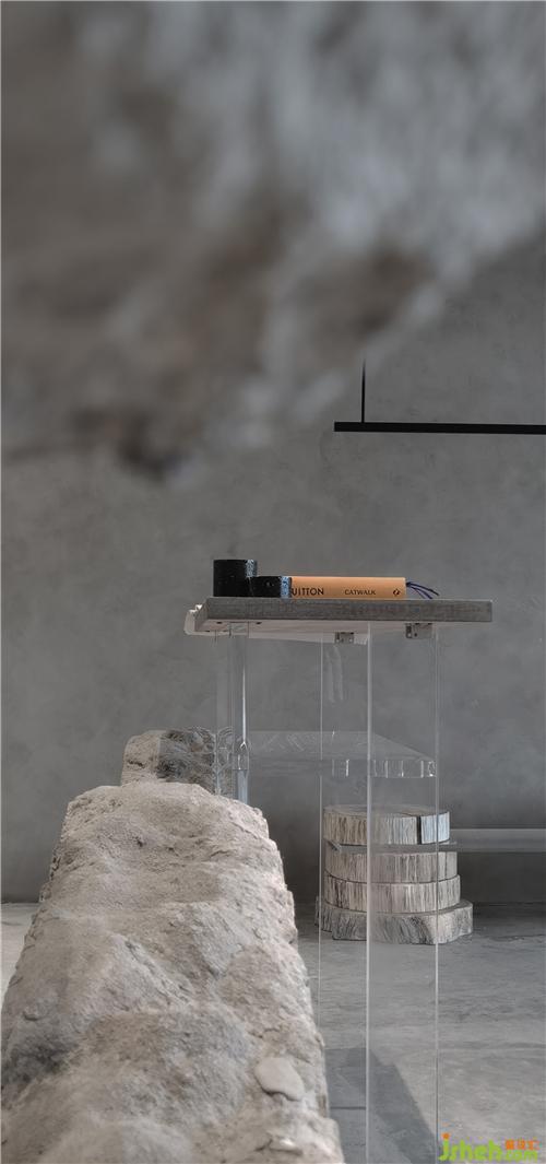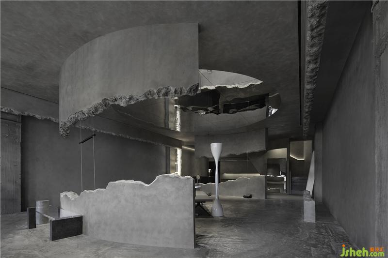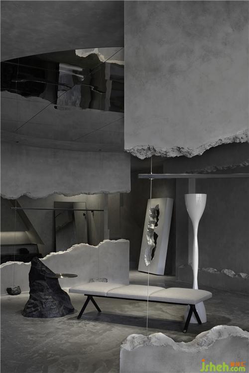 The whole space is " Out of Place " with the surrounding environment. They are like ruins, but they are so different. It is spiritually independent, firm and silent. The walls of mottled texture split symmetrically from top to bottom. Although they are separated, they form a corresponding relationship. People can peep at everything in the cracks, as if they can see the future world from the cracks . At the same time, it is also in response to the design to show the owners and corresponding consumer groups, they all have a unique aesthetic, unique vision, and a different point of view of the world.