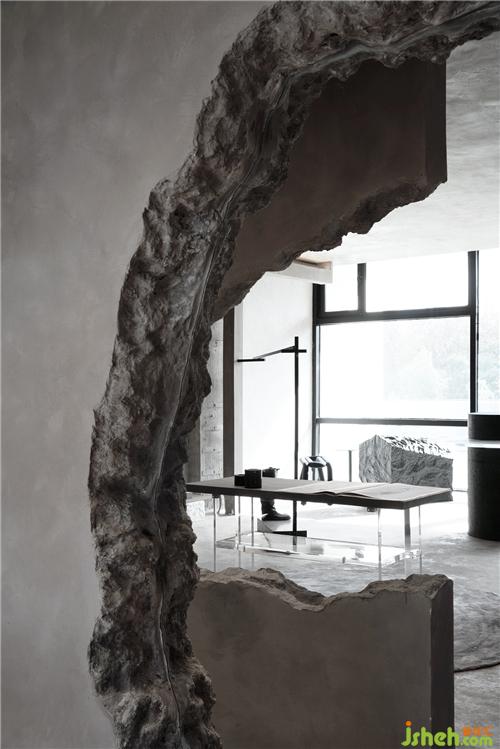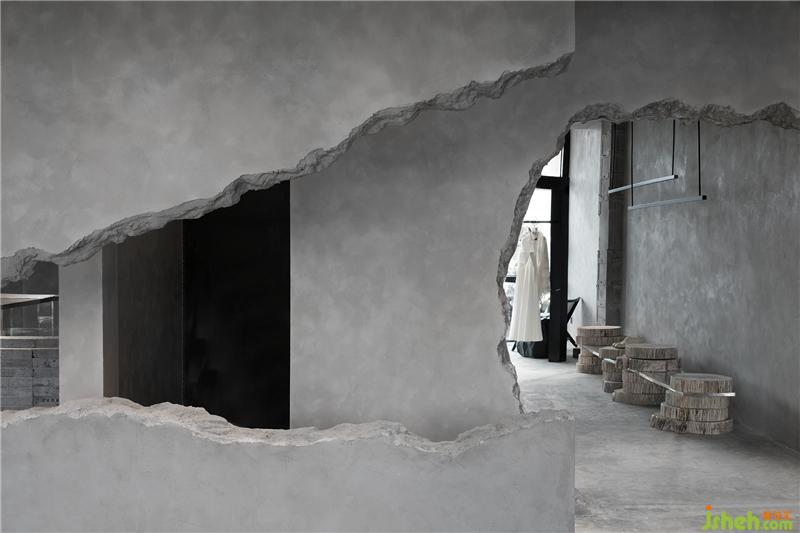 整個(gè)空間與周圍的環(huán)境“格格不入”,它們像廢墟一樣,但卻又如此與眾不同。它在精神上自我獨(dú)立,堅(jiān)定沉默。斑駁質(zhì)感的墻壁上下對(duì)稱裂開,兩者雖相隔卻成呼應(yīng)關(guān)系。人們可以在夾縫中窺探一切事物,仿佛能從夾縫中看到未來的世界。同時(shí)也是呼應(yīng)設(shè)計(jì)上想要呈現(xiàn)出業(yè)主和對(duì)應(yīng)的消費(fèi)群體,他們都有著獨(dú)特的審美、獨(dú)特的眼光,以及不一樣的角度來看世界。