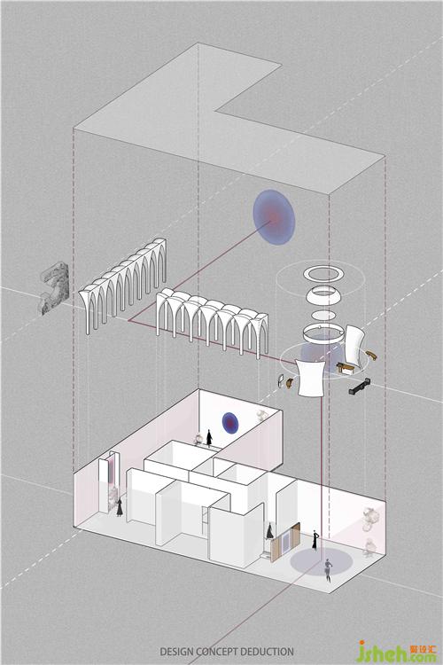 穿過時空長廊,時空維度變成了一個明亮、虛幻且充滿潔凈的空間,充滿未來無限可能性。兩點成一弧,形成教堂元素的夾角,時空維度的邊界墻面,既是設(shè)計靈感的象征之一,又是對破碎墻體的隱喻。