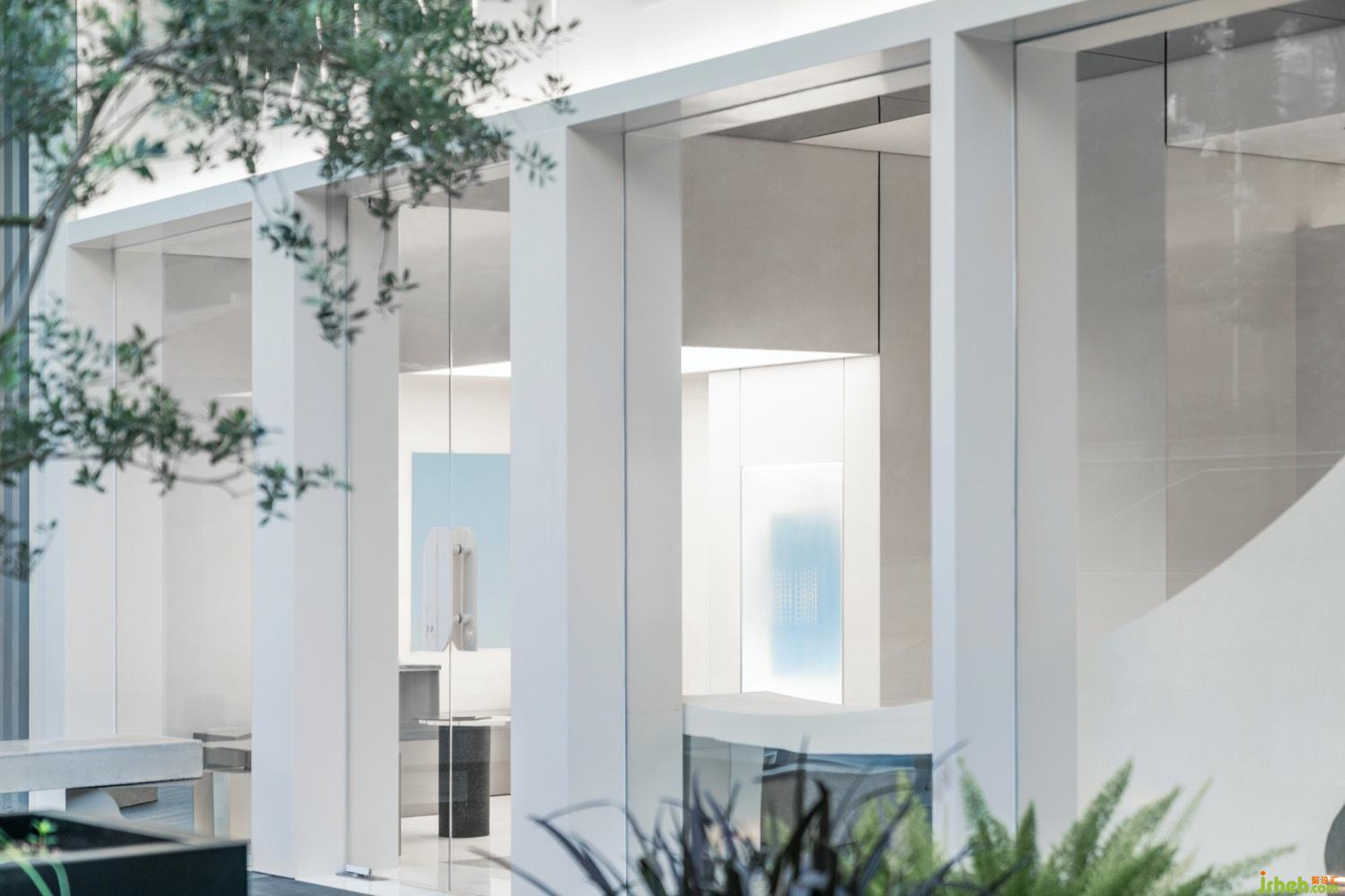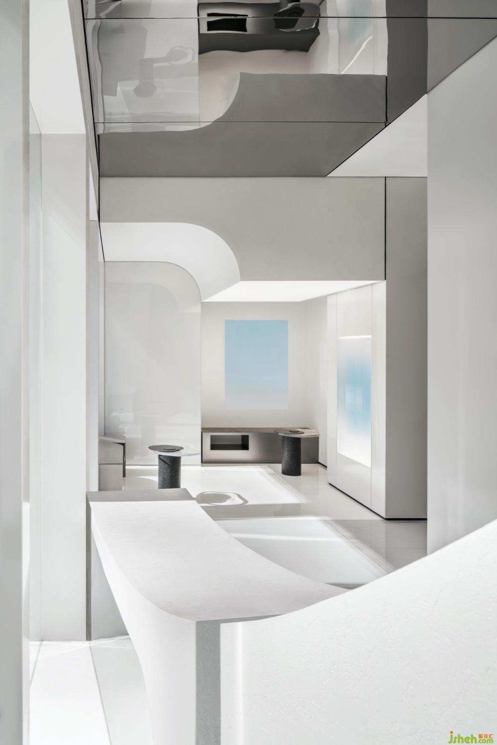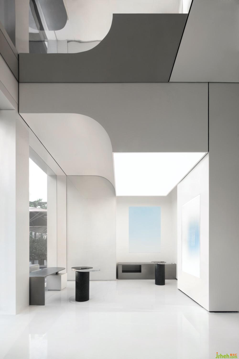 設(shè)計(jì)師減少空間多余的裝置和梁柱,為展示區(qū)提供更多靈活性的可能;將空間的動(dòng)線規(guī)劃變得有故事性并且保持多功能性,同時(shí)讓里面的空間處于一種半遮半掩的效果, 去物質(zhì)傳統(tǒng)性和非永久瞬間性特質(zhì)使其成為一種空間藝術(shù)手法輸出的媒介。室內(nèi)設(shè)計(jì)師