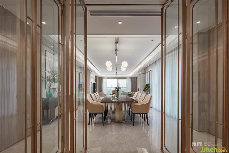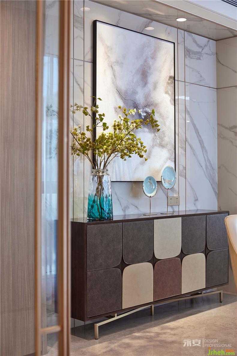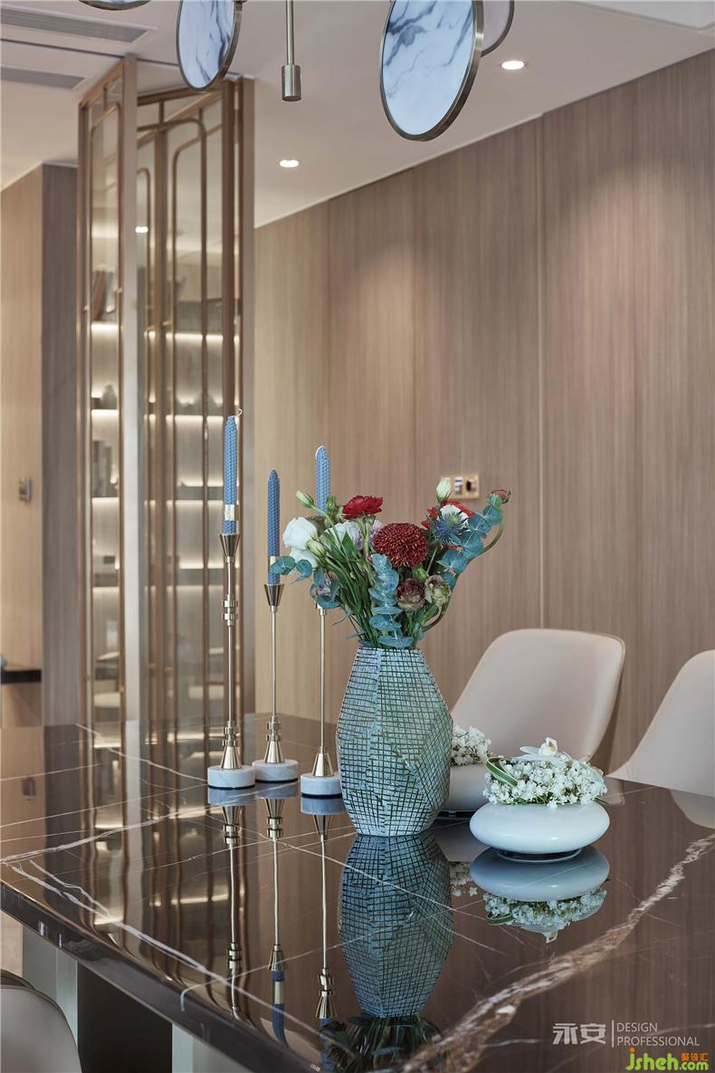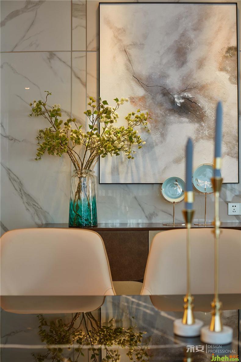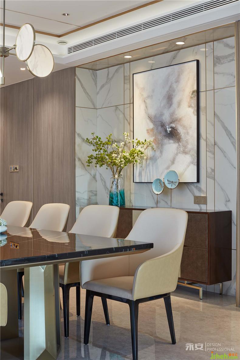 餐廳周遭的環(huán)境配置,設(shè)計(jì)師從色調(diào)以及軟裝入手,通過(guò)木色、米黃、黃銅色等較為溫暖的色系來(lái)烘托出一個(gè)溫馨平和的用餐氛圍,勞倫黑金大理石的餐桌、上方團(tuán)扇吊頂燈的加入、以及油畫(huà)和盆飾的映襯,使得整個(gè)餐廳環(huán)境既有著東方文化的底蘊(yùn),又有著西式風(fēng)情的明朗典雅。