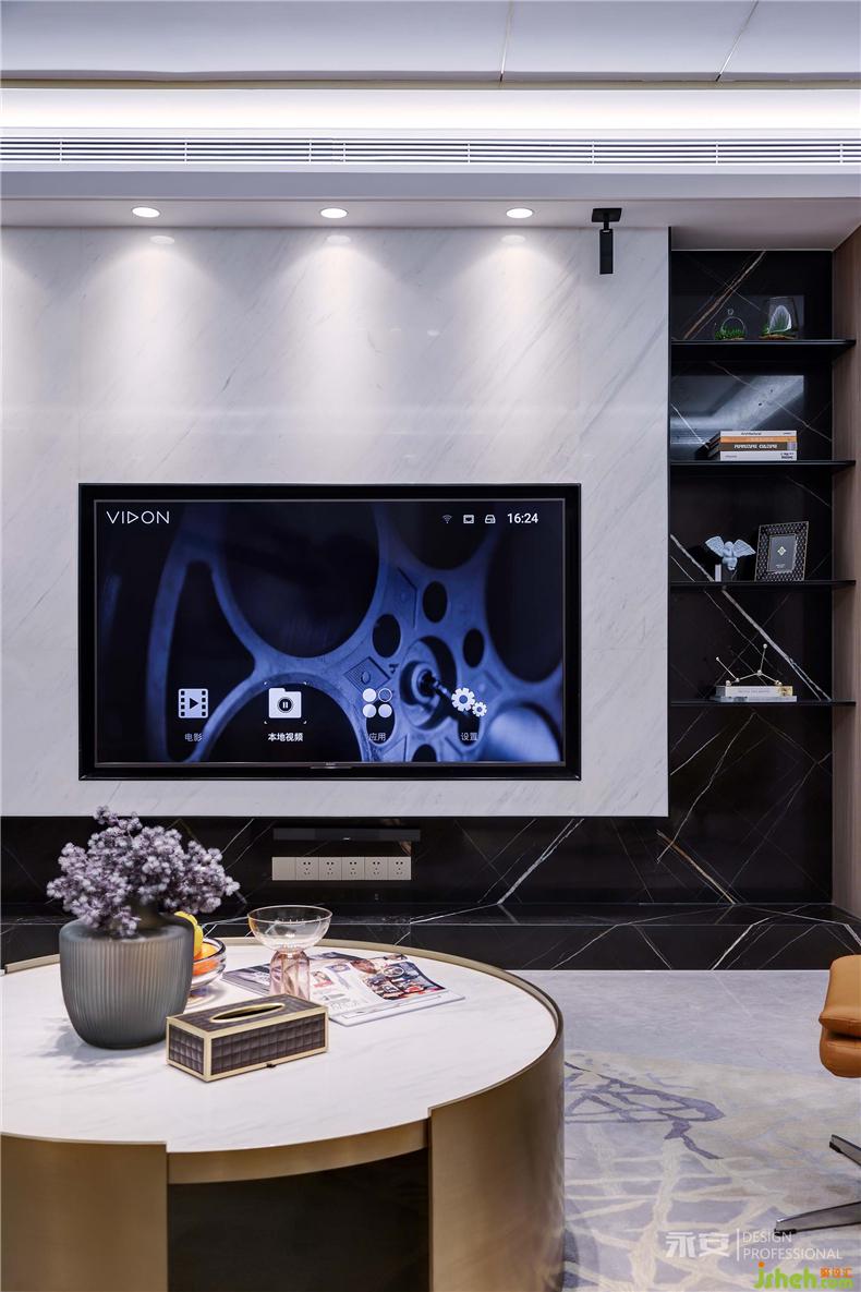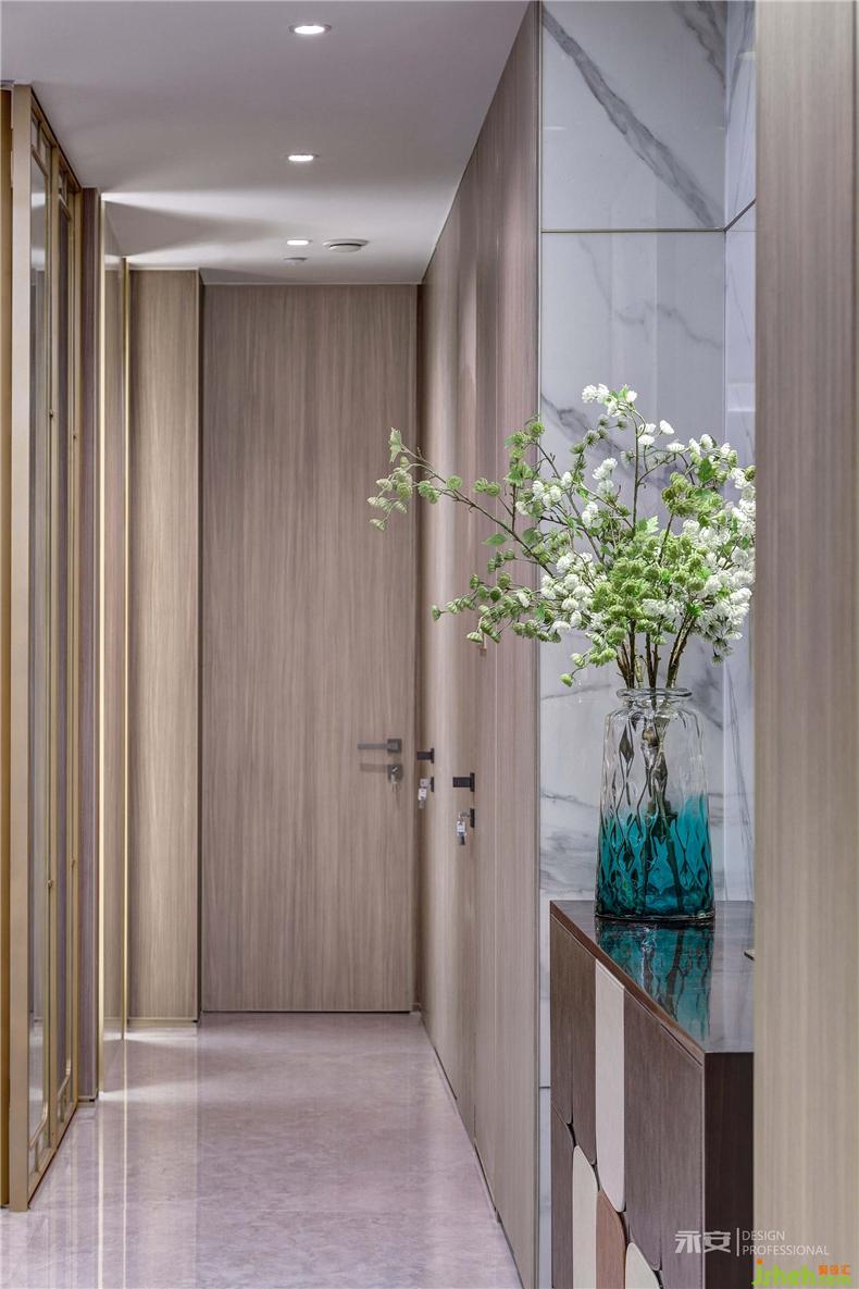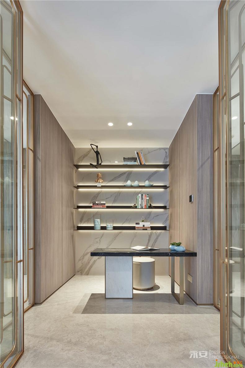 設(shè)計(jì)師在構(gòu)建本案茶室時(shí),在傳統(tǒng)功能性的基礎(chǔ)上,加入了現(xiàn)代美學(xué)的理念,室內(nèi)設(shè)計(jì)師保持低奢風(fēng)格整體一致性的同時(shí),采用半阻隔式設(shè)計(jì),以中式元素的黃銅玻璃門(mén)為屏風(fēng),閉則屏風(fēng)頂天立地,內(nèi)部自成一界,開(kāi)則又與外部空間融為一體,不分彼此。茶室內(nèi)部以木飾面板、石材、鐵件為設(shè)計(jì)元素,精致而優(yōu)雅,現(xiàn)代都市的審美理念穿插其間。