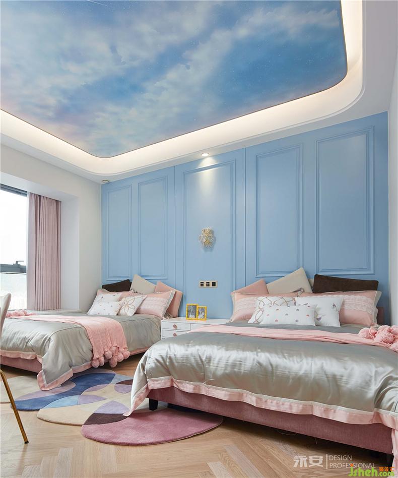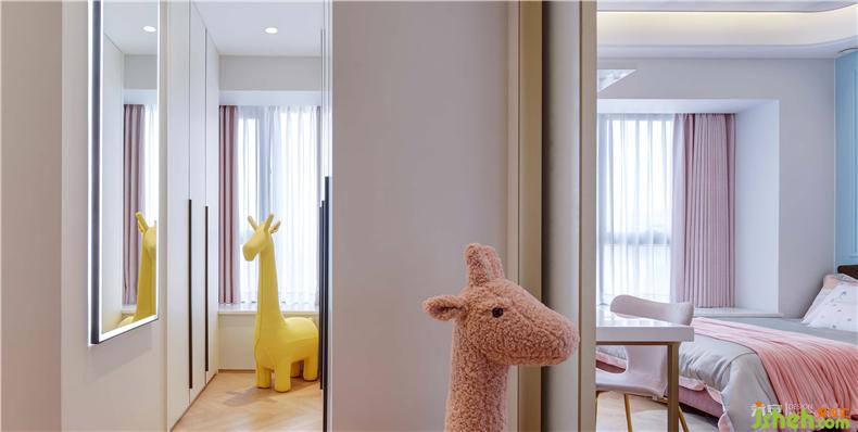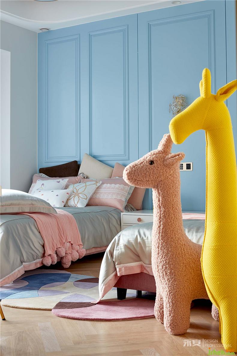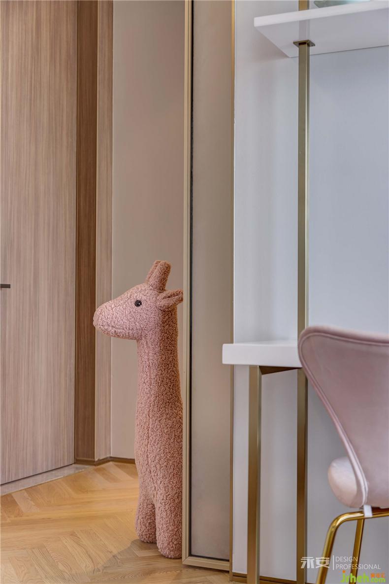 房內(nèi)的軟裝陳設(shè)也是設(shè)計者對童心的細微呵護,兩只萌萌的長頸鹿是公主們天馬行空般童話世界里的玩伴,童趣的床尾墊在呼應房間主題的同時,也起到了應有的保護作用