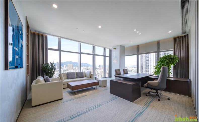 辦公室右側與前方是兩扇玻璃墻,向外望去,城市山川盡覽眼底。辦公室設計將遠景與陽光引入空間敘事,設計語言通過空間構型與材質色彩,隱示出展望遠方的空間立意