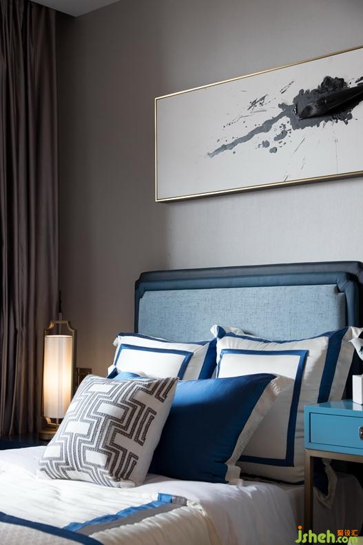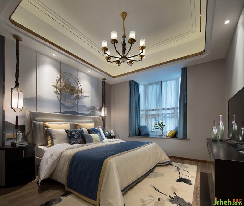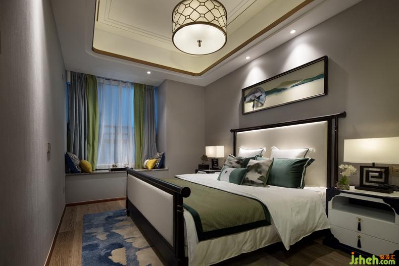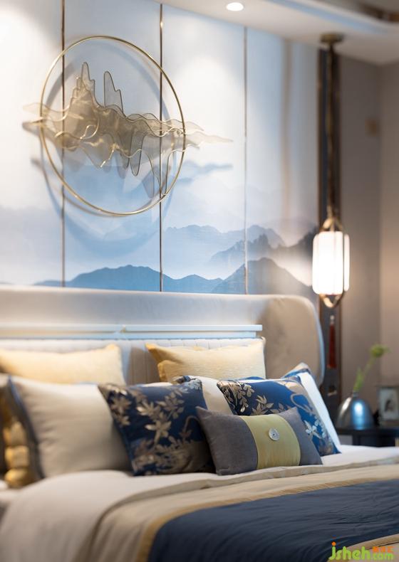 主臥延續(xù)新中式風(fēng)格的淡雅意境,水墨勾勒的淺白色地毯和虛靈縹緲的遠(yuǎn)山背景墻相互映襯,為現(xiàn)代生活融入素雅的東方韻味和美感。