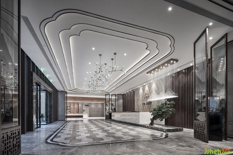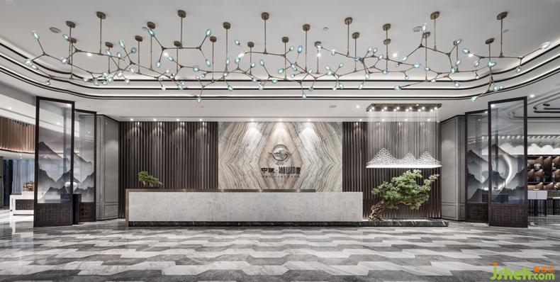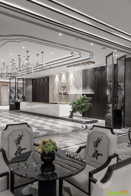 步入前廳,雅致的中式風(fēng)情和靈透的人文氣息融為一體,接待臺(tái)采用拼紋玉石背景墻面,以植物果實(shí)為元素設(shè)計(jì)的吊燈自由懸掛組合,整體空間通透大氣而不乏靈動(dòng)寫意。