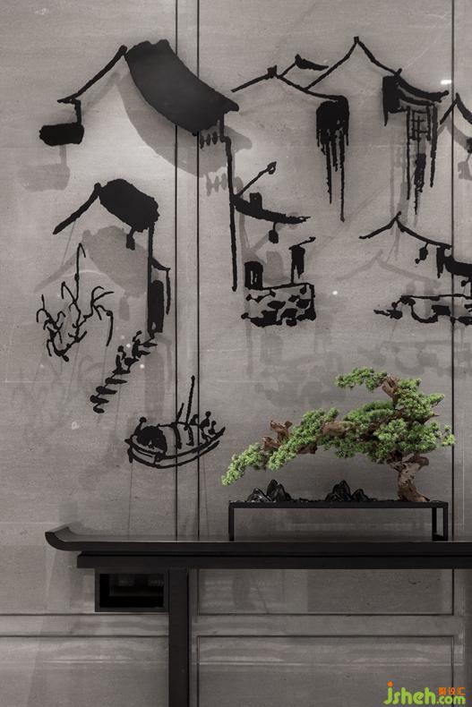 拼紋玉石大理石墻面立于中間,兩邊虛實(shí)結(jié)合的立體式木格柵營造出山城的印象,于不同角度呈現(xiàn)不同的立體效果;右側(cè)以園林白色細(xì)石結(jié)合松屬植物形成獨(dú)特的人文景觀,為前廳增添了盎然綠意和生機(jī)。