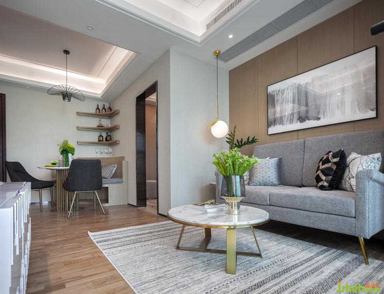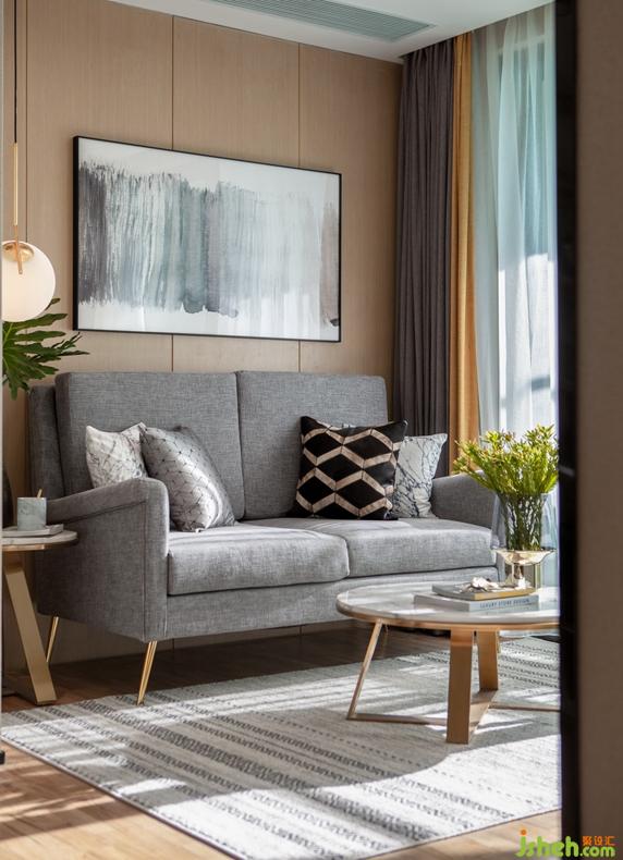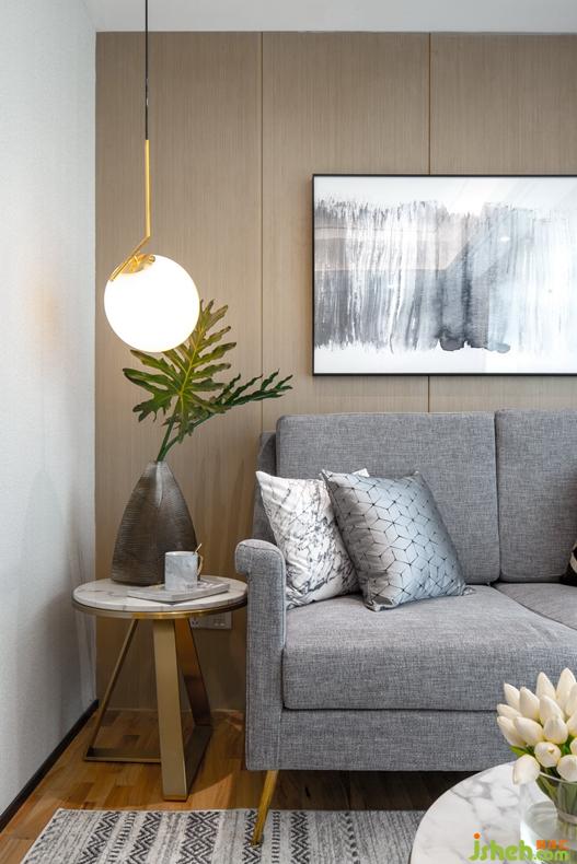 立體飽滿(mǎn)的高級(jí)灰棉麻沙發(fā),搭配北歐風(fēng)條紋抱枕,加上球形藝術(shù)吊燈和桌案上綠色植物的點(diǎn)綴,構(gòu)成客廳慵懶而美好的舒適氛圍。