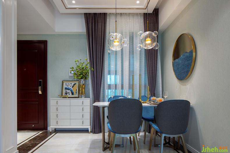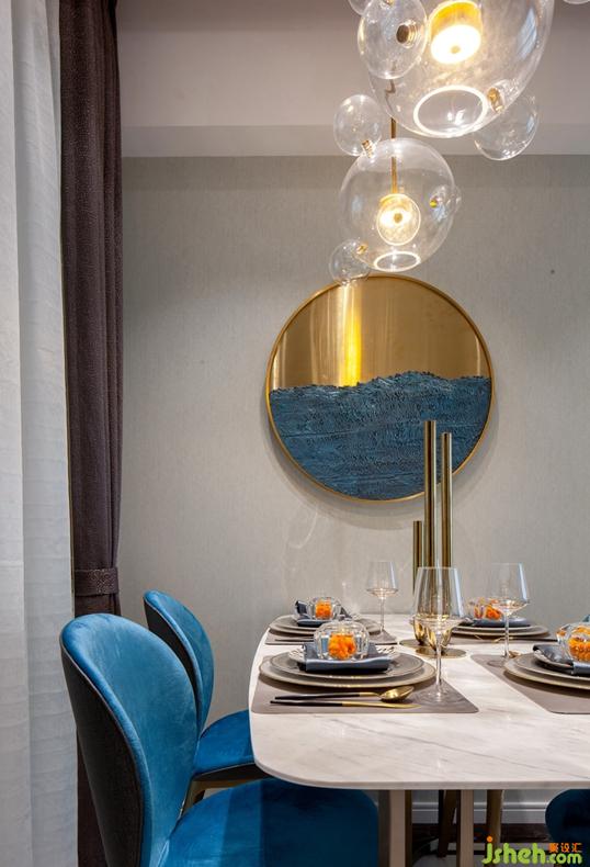 軟裝上圓形透明藝術(shù)吊燈懸掛餐桌之上與背景墻面一幅簡約金屬與海軍藍的圓形裝飾畫元素呼應(yīng),金屬的質(zhì)感,玻璃的靈動性,是整個空間的藝術(shù)氣息躍然眼前,演繹時尚和藝術(shù)的結(jié)合,呈現(xiàn)輕奢品質(zhì)生活。
