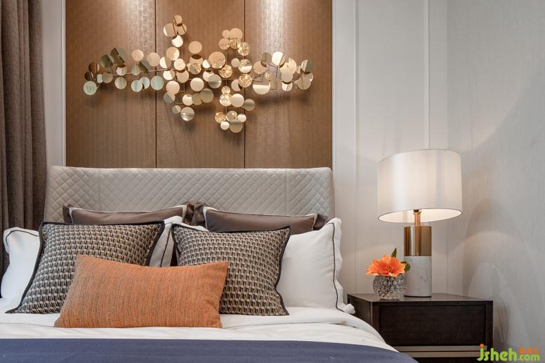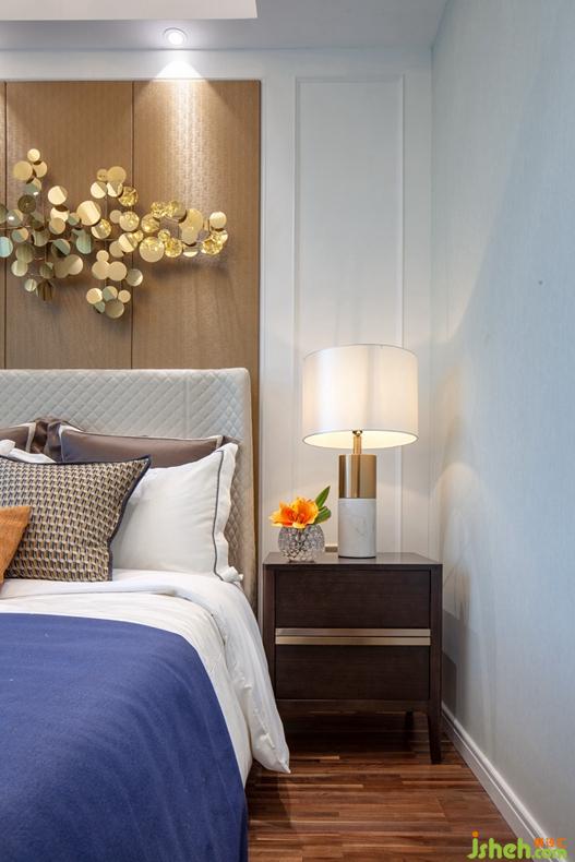 主臥床頭背景使用線條簡(jiǎn)約的白色護(hù)墻板與金棕色的皮革硬包相互融合,體現(xiàn)了整個(gè)空間的現(xiàn)代奢華感,低調(diào)卻不簡(jiǎn)單。