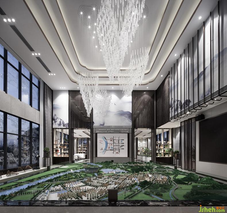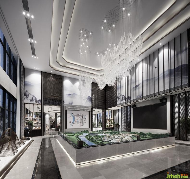 沙盤區(qū)吊燈結(jié)合仰天湖水的流動(dòng)形態(tài)及昭山的蜿蜒走勢(shì),進(jìn)行材質(zhì)與造型的選擇,強(qiáng)調(diào)項(xiàng)目的依山傍水的地理優(yōu)勢(shì),同時(shí)借助層高優(yōu)勢(shì)塑造沙盤區(qū)的視覺(jué)亮點(diǎn),優(yōu)雅而不乏儀式感。