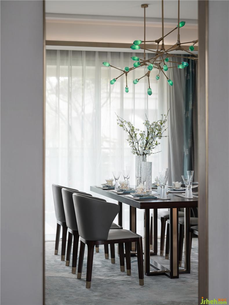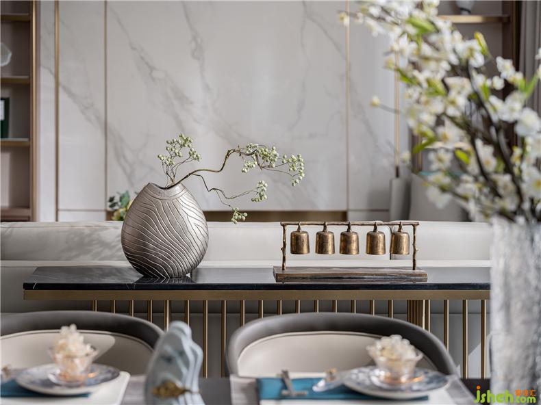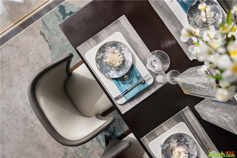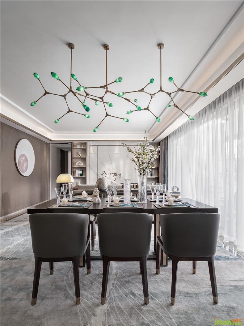 餐廳上方懸掛極具設計感吊燈,用極簡的設計寓意碩果累累,為空間加注靈氣,樣板房設計餐桌椅與空間整體色調(diào)一致,給人沉穩(wěn)尊貴的印象,杯盤交錯間,加以金屬構(gòu)件裝飾,為視覺路徑創(chuàng)造停留點