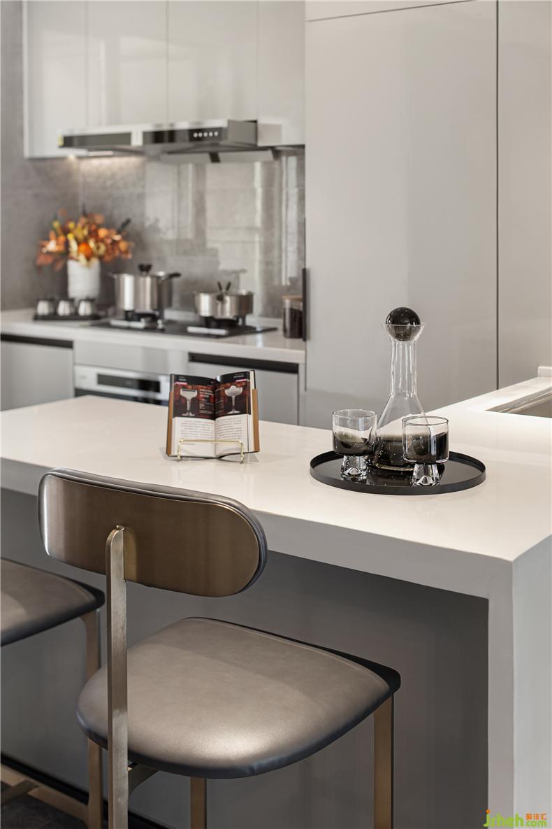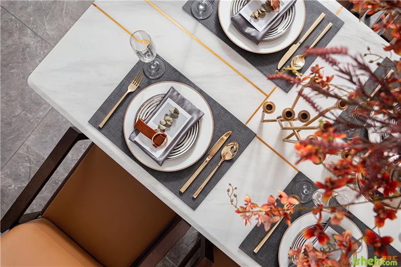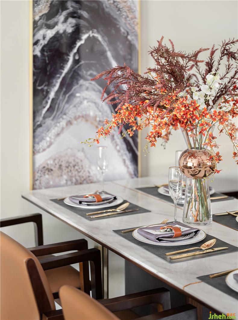 天然大理石臺(tái)面搭配具有裝飾線條感及簡(jiǎn)約、節(jié)省空間的桌腳設(shè)計(jì),樣板房設(shè)計(jì)有助于于餐椅的擺放使用方便性