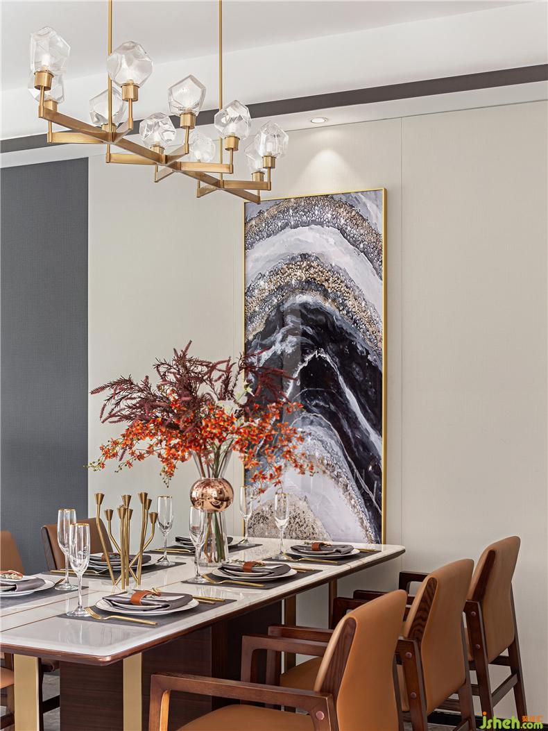 開(kāi)闊明餐廳,軟裝設(shè)計(jì)強(qiáng)調(diào)審美在外質(zhì)感在內(nèi),與客廳同源的背景裝飾畫(huà)為空間注入輕盈靈動(dòng)氣質(zhì)。充滿設(shè)計(jì)感的餐桌、餐椅傳遞優(yōu)雅儀式感,醞釀出現(xiàn)代詩(shī)意。