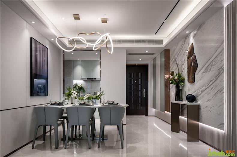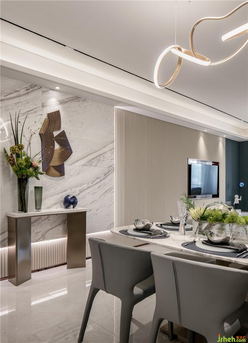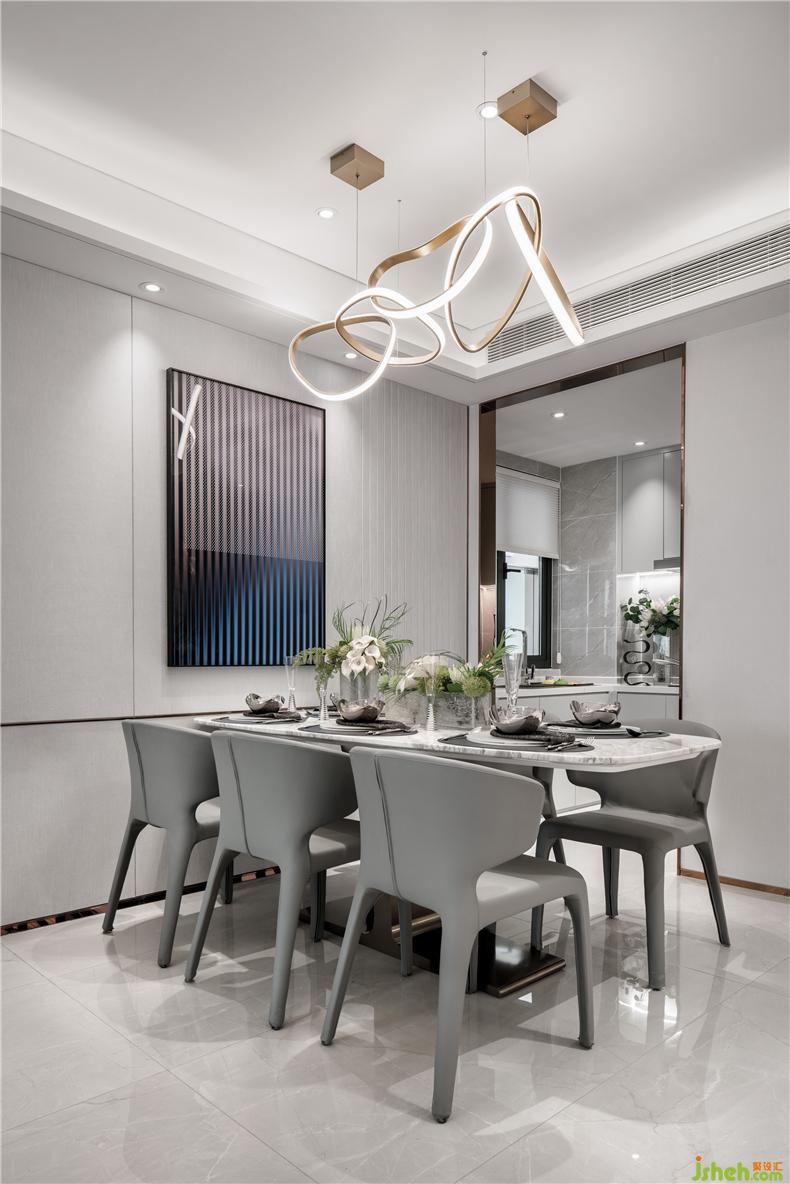 簡單、樸實、明凈是餐廳空間的代名詞,晶瑩剔透的餐具擺件映入眼簾,樣板房設(shè)計深色與淺色穿插的搭配既與空間氛圍照相輝映又與極光般的藝術(shù)燈具遙相呼應(yīng),從而達(dá)到承上啟下的渲染作用。