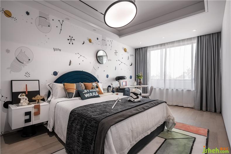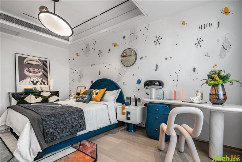 空間運用低調的煙灰藍打造別致溫馨的居住氛圍,帶著十分簡約科技圖案的墻紙與時尚飾品使簡約讓空間布局多了些許立體感