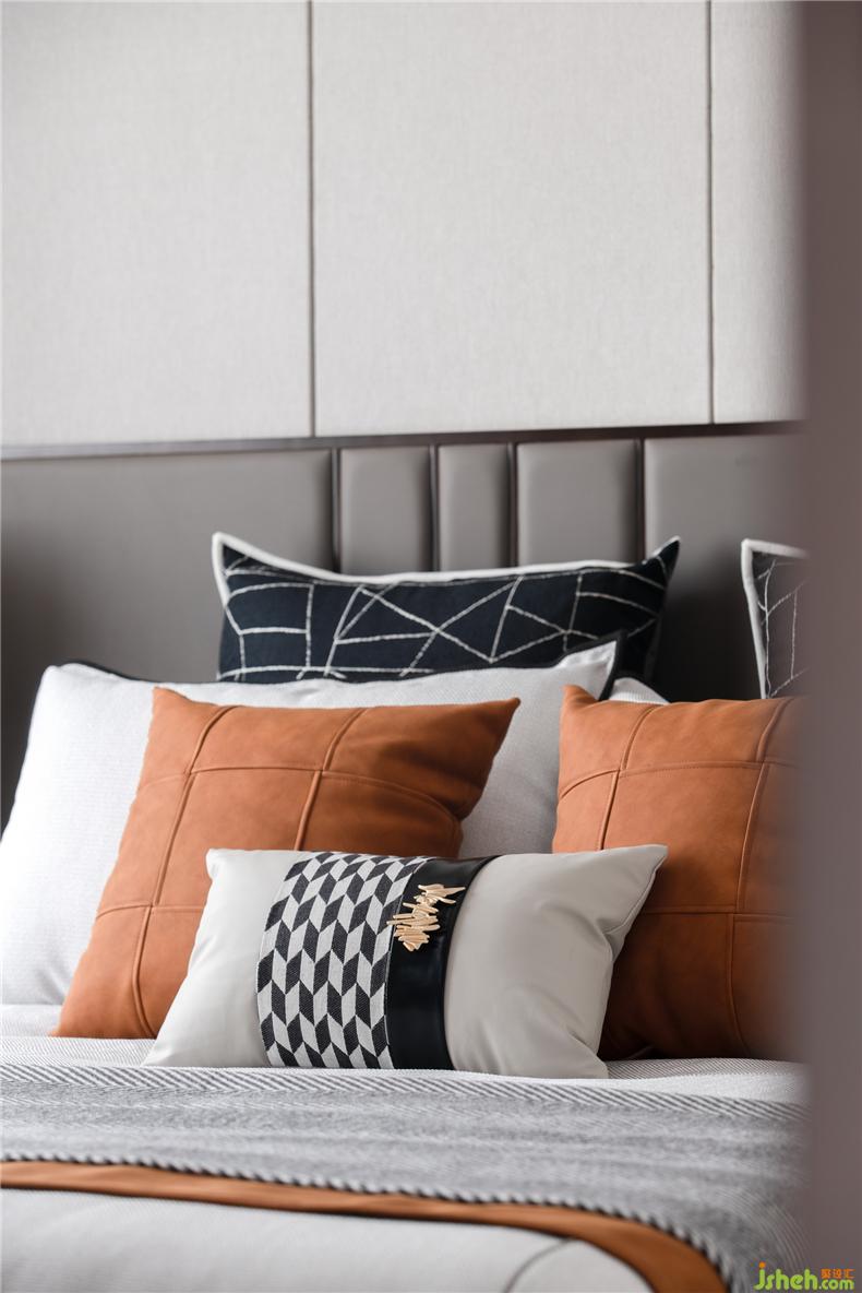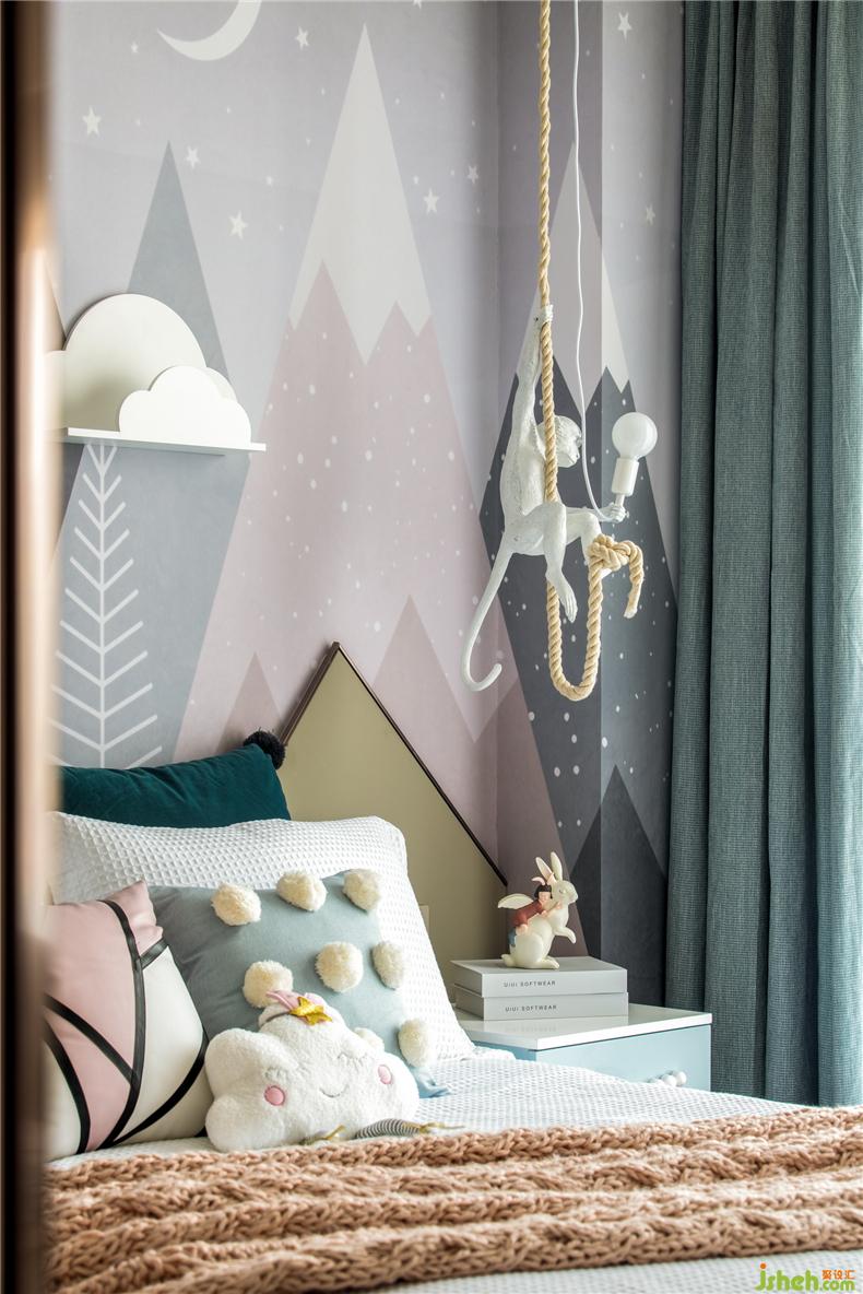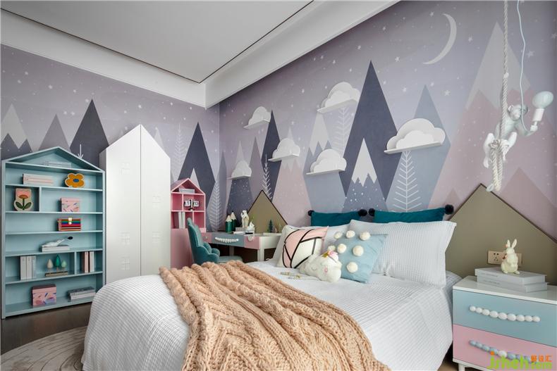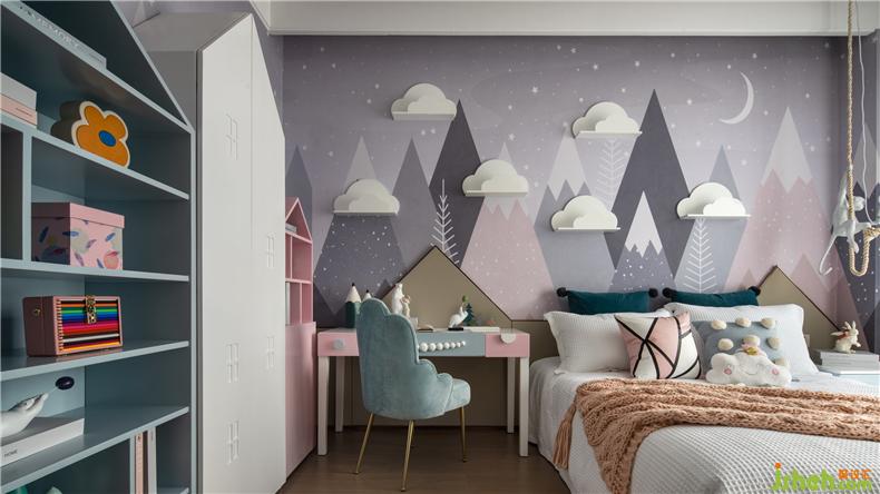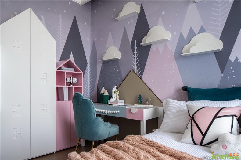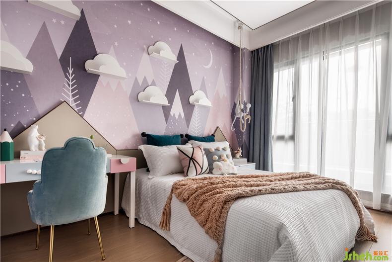 女兒房背景為柔和的紫色圖案墻紙,軟裝在家居造型上以現(xiàn)代為主,造型簡練,樣板間設計也不乏一些讓人欣喜的創(chuàng)意巧思。棉麻布藝本就有一種質樸的優(yōu)雅,而淺橙色和紫粉色又讓空間更多了一份清新活力。