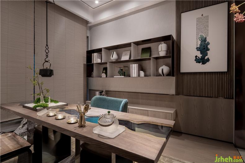 茶室兼顧閱讀室,借助玄關格柵透過來的光線自然,婉約閑逸,訴一段心語幽思,流淌于清淺時光,一抹寫意,幾許禪意,琴棋書畫,詩酒茶花,每一閑情雅致都能在這一方天地里怡然自得。此境此景,當言“明窗凈幾,筆硯紙墨皆極精良,亦自是人生一樂。”
