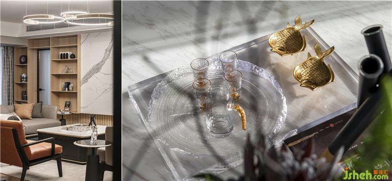 客廳空間開闊,布局明朗,電視背景墻部分整體墻面設(shè)計(jì),集儲物與裝飾功能一體,魚肚白大理石、木色的展示柜、長虹藝術(shù)玻璃門隱形門鑲嵌其中,材質(zhì)與色彩碰撞,迸發(fā)生機(jī),賞心悅目。