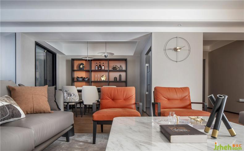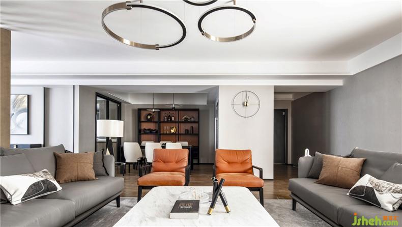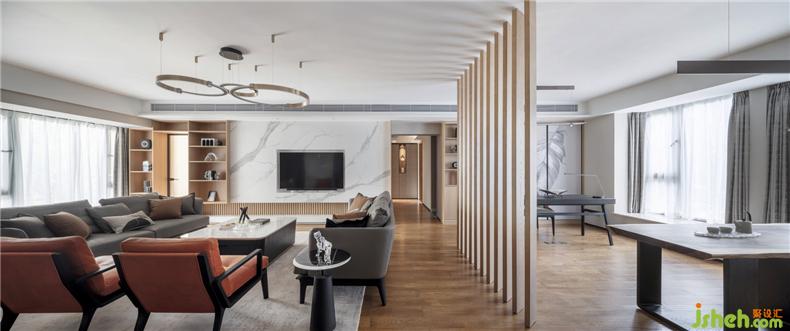 原始結(jié)構(gòu)房屋居中橫貫的一道29cm的低梁,被設(shè)計(jì)師利用做為餐廳吊頂,作為客廳、餐廳和書房區(qū)域的虛擬隔斷,一舉兩得。