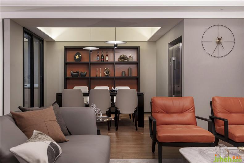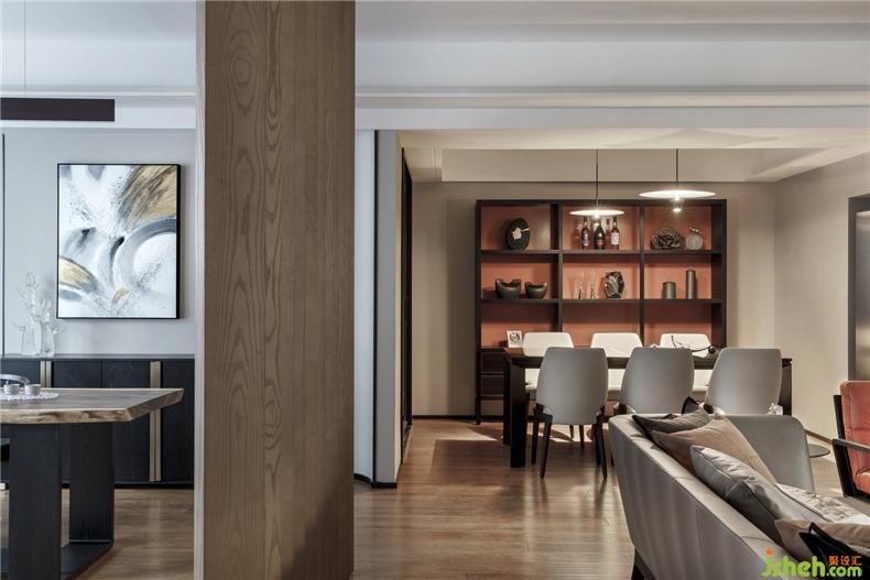 在餐廳設(shè)置有大型酒柜,深色的木質(zhì)感,傳遞出高雅的品味,搭配充足的置物空間,能充分滿足男主人的藏酒愛好。