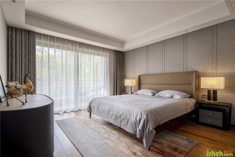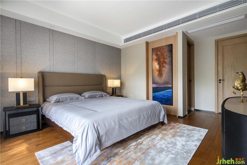 男主人的臥房主臥同樣簡(jiǎn)約大方,在一側(cè)的墻壁上是男主人精心挑選的裝飾畫(huà),典雅又極富品位。