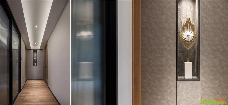 走廊的過(guò)道在燈光的映射下纖長(zhǎng)柔美,私宅定制設(shè)計(jì)盡頭的太陽(yáng)光裝飾是女主人精心挑選的飾品,雅致浪漫??此瓶諢o(wú)一物的過(guò)道墻面后,實(shí)則是一整排的儲(chǔ)物空間,能充分滿足男女主人的儲(chǔ)物需求。