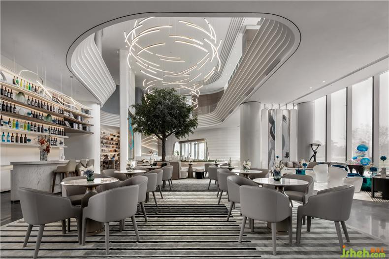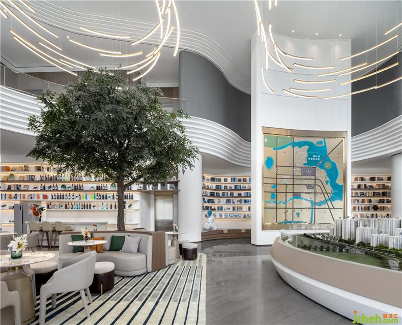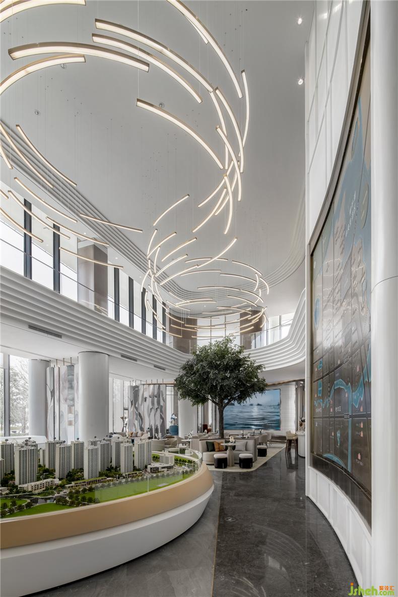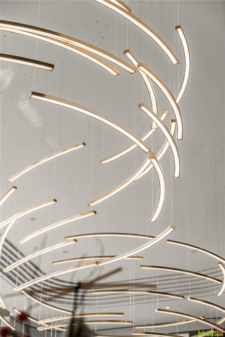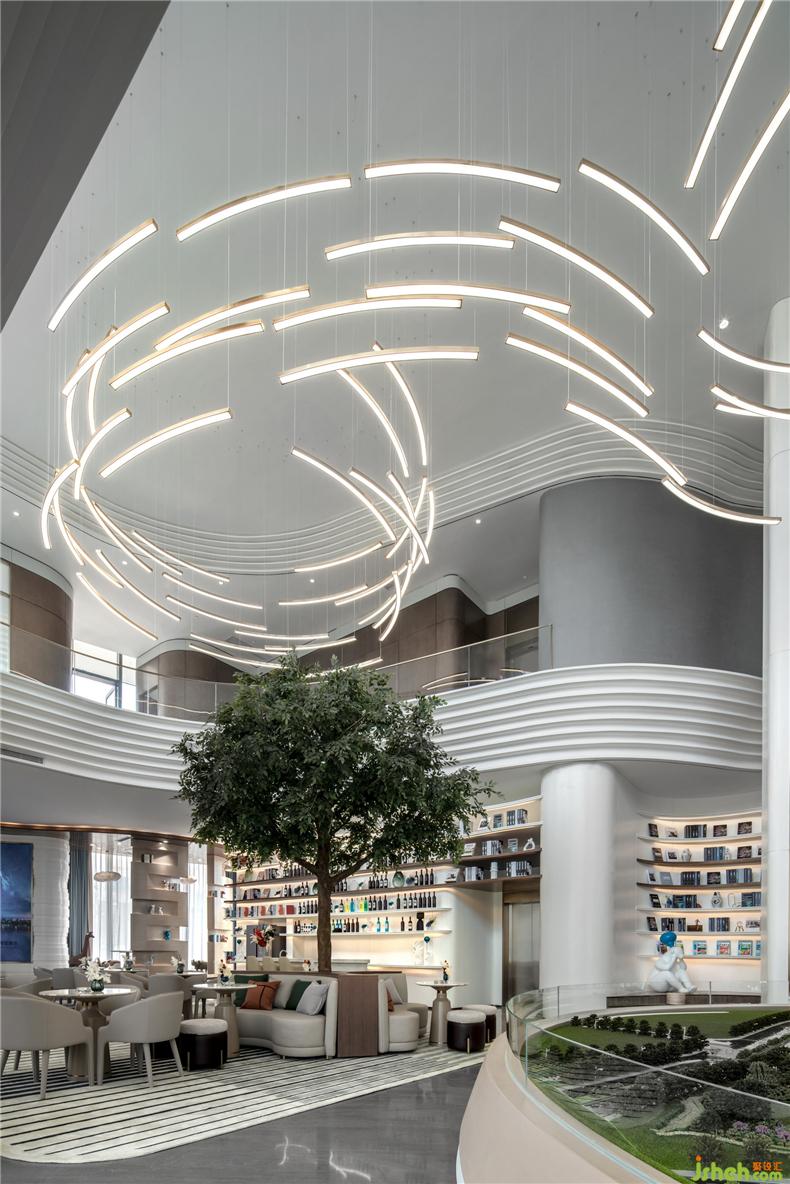 銜接一二層之間的是一盞巨大的藝術(shù)吊燈,橫貫洽談區(qū),以水波紋為設(shè)計靈感,用藝術(shù)的手法,抽象的表現(xiàn)水流形態(tài),給人留下視覺震撼。以水便以水為媒介,藉由自然光影與建材紋理, 捕捉水波的藝術(shù)姿態(tài),注入設(shè)計理念, 并將其貫穿在空間當(dāng)中,讓人留住當(dāng)?shù)氐乃洃洝?