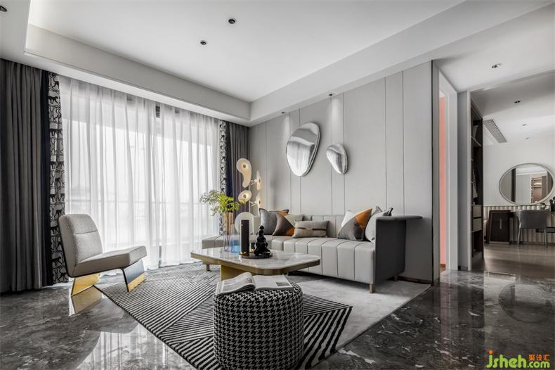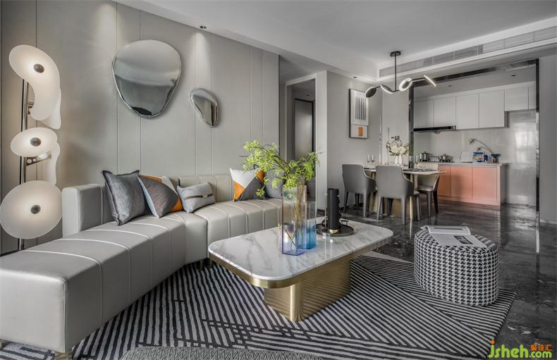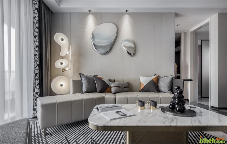 別具新意的不規(guī)則沙發(fā)設(shè)計,立體跳躍的圓形金屬裝飾掛件,樣板房設(shè)計皮革、金屬等元素和諧交織,在定義空間的同時,以摩登的立體化設(shè)計編制出空間豐富的表情