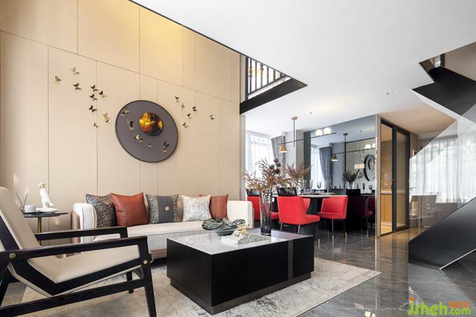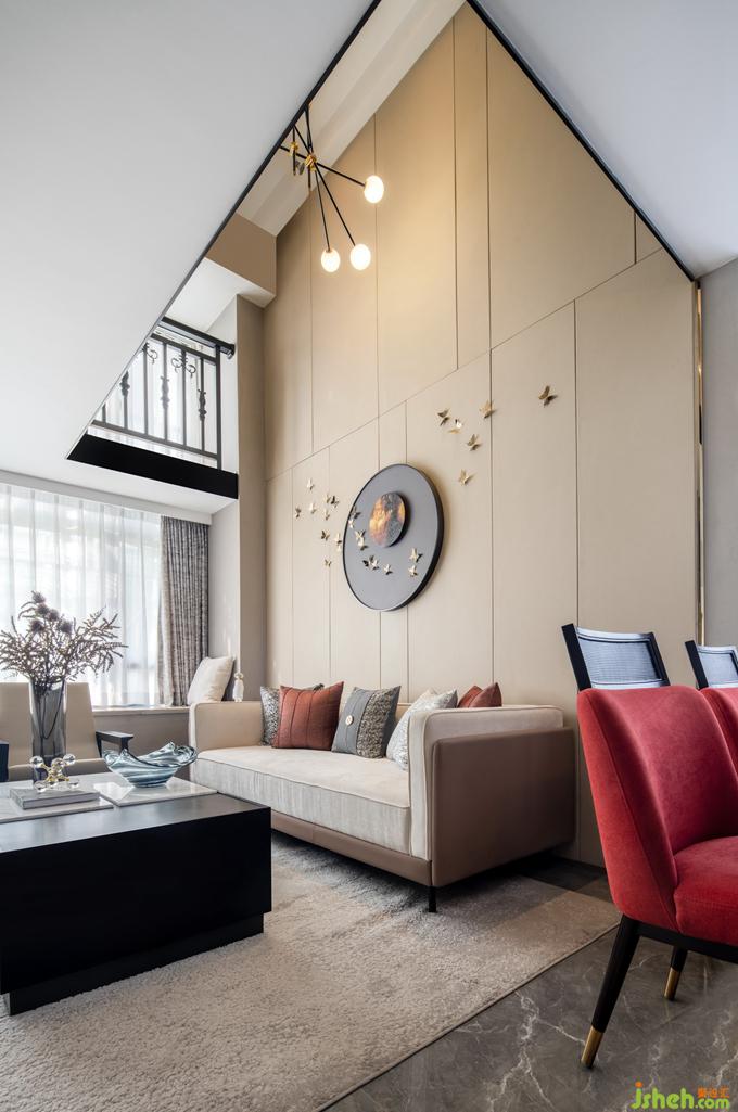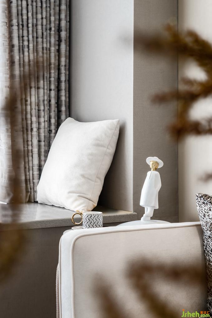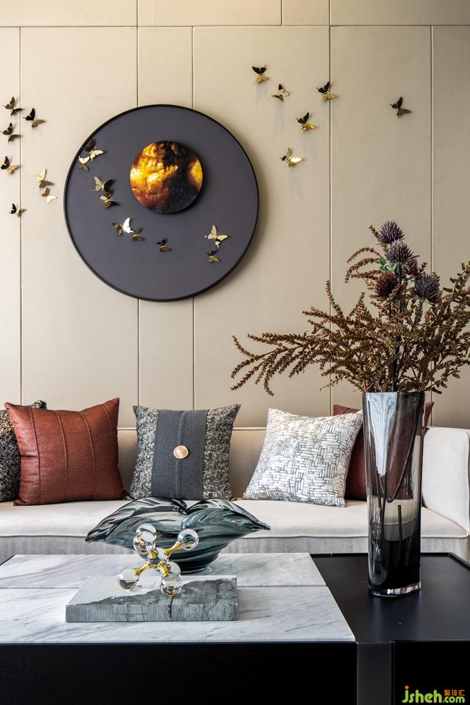 客廳空間精致且極富個性,無論是靈動的燈飾,抑或充滿層次感的茶幾,樣板房設(shè)計(jì)沙發(fā)背景墻充滿奇思妙想的藝術(shù)裝置,窗簾上的格紋,甚至是映射在花瓶上微微扭曲的視線,都是卸下中規(guī)中矩這個枷鎖的利器。